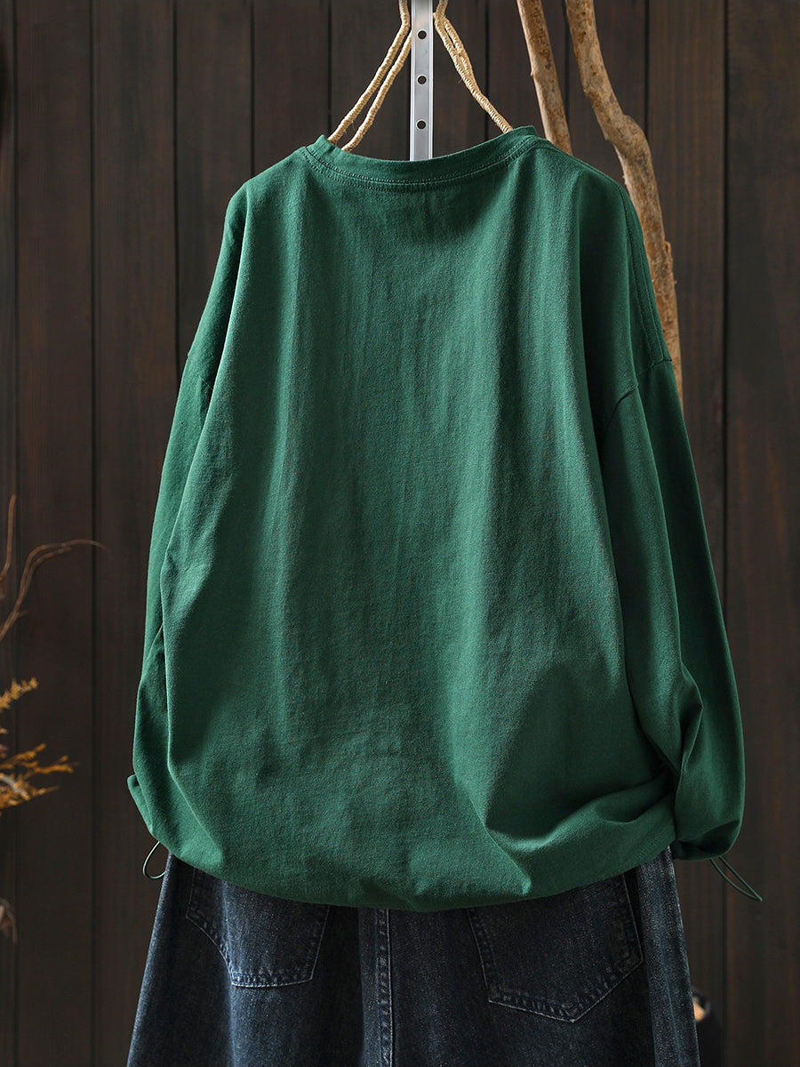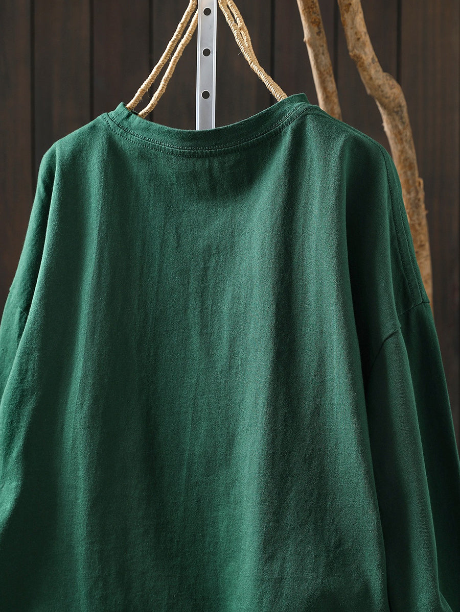 Women Spring Artsy Flower O-Neck 100%Cotton BlouseWomen Spring Artsy Flower O-Neck 100%Cotton Blouse