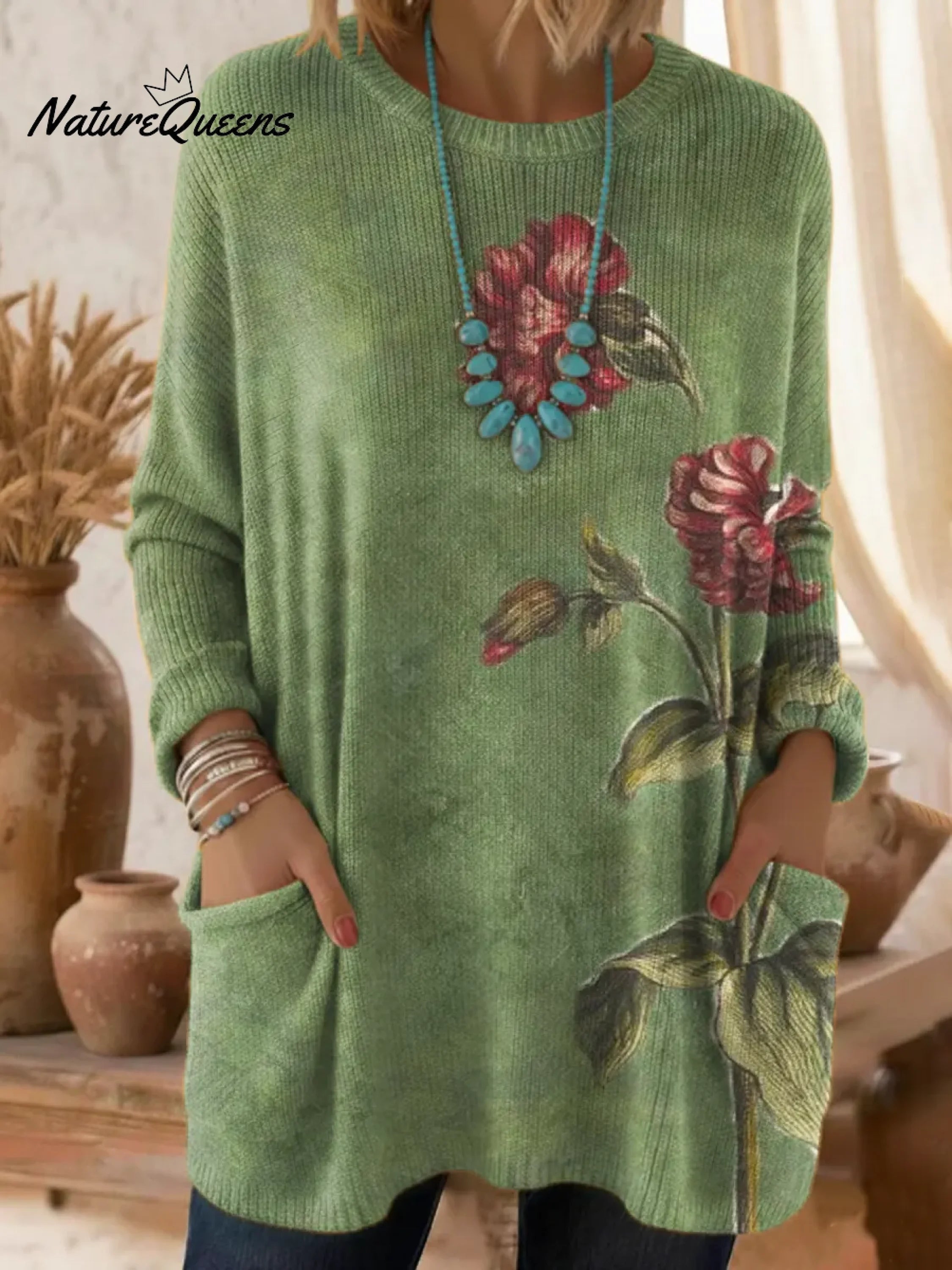 Women's Floral Pattern Art Print Casual Cotton Knitted Sweater