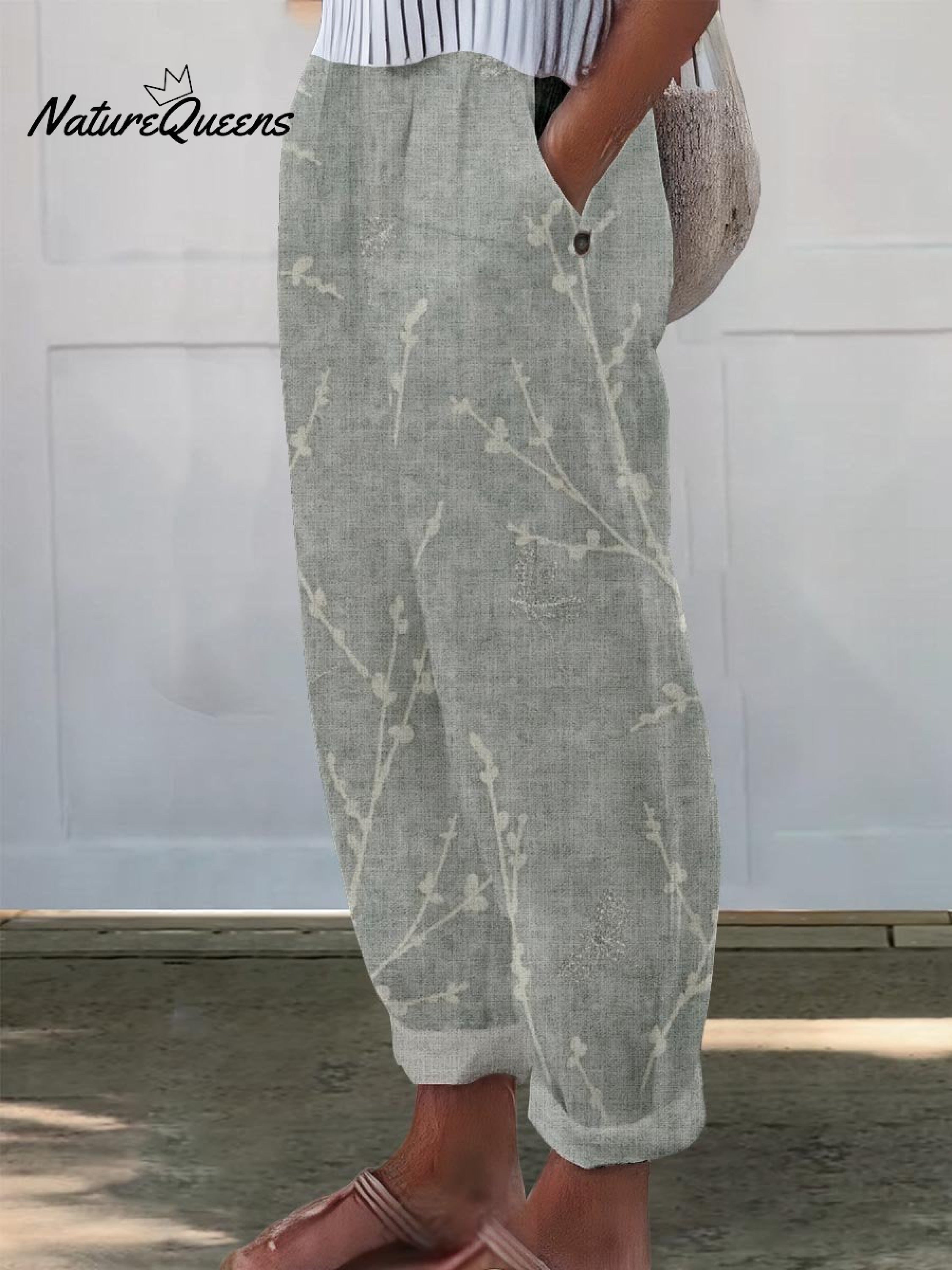 Women's Flowers And Leaves Art Pattern Printed Cotton And Linen Casual Pants