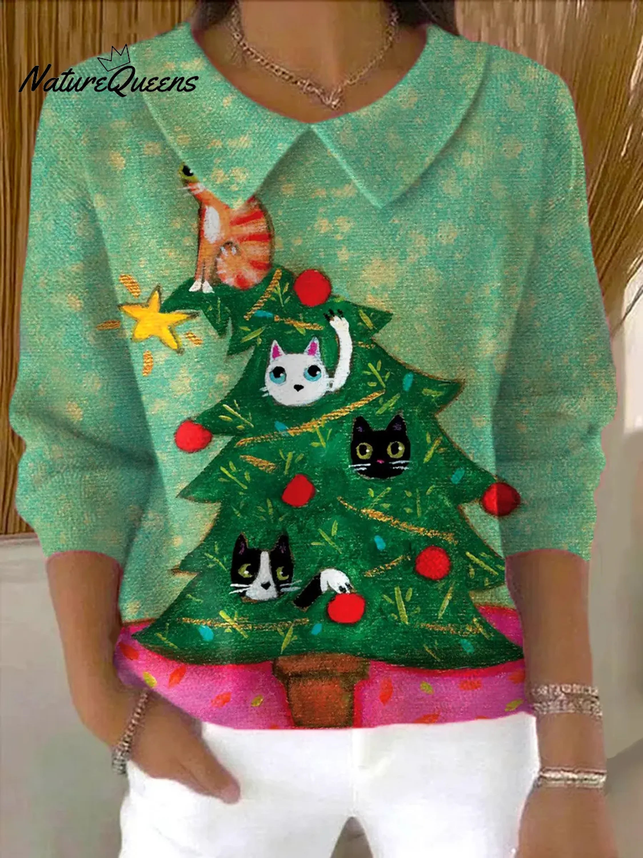 Women's Christmas Tree Cat Print Casual Peter Pan Collar 3/4 Sleeve Sweater