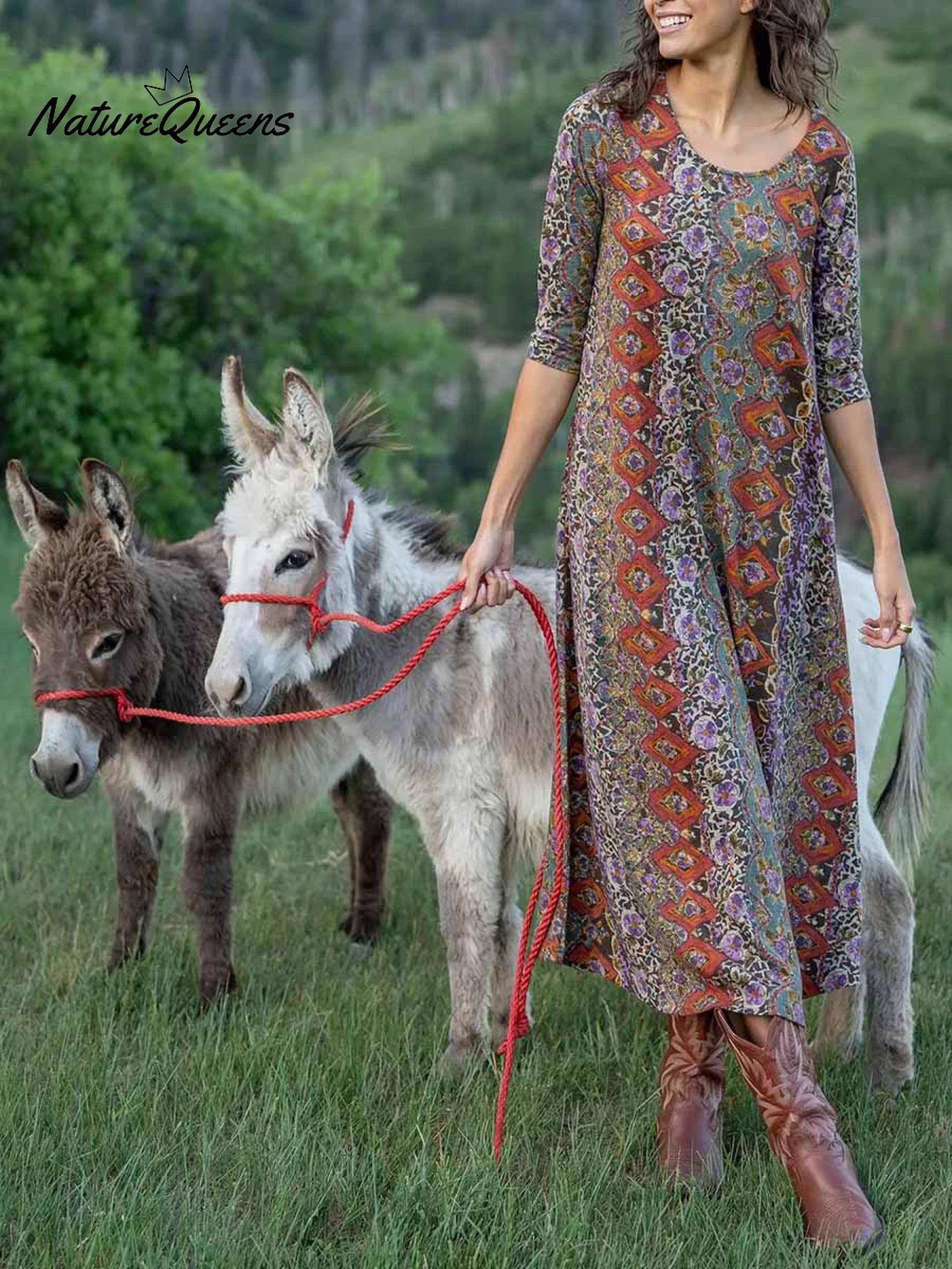 Women's Retro Floral Print Round Neck 3/4 Sleeve Casual Loose Dress