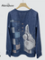 Funny Cat Print Patchwork Cotton Crew Neck Top