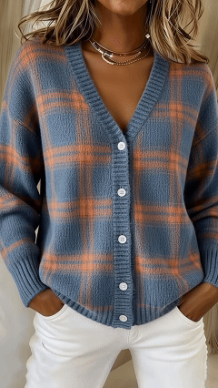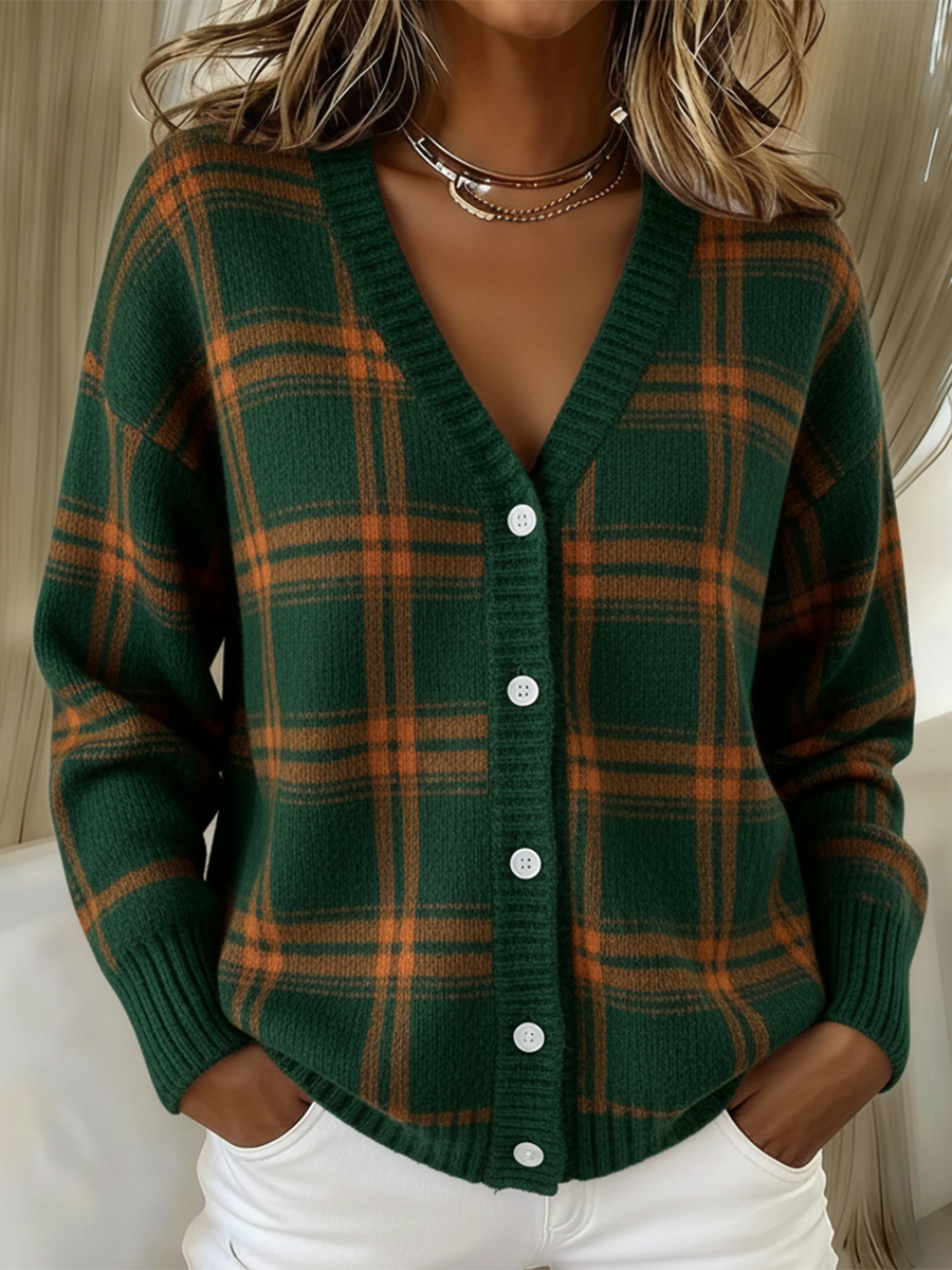 Retro Soft Plaid Contrast Color V-Neck Button Knit Cardigan