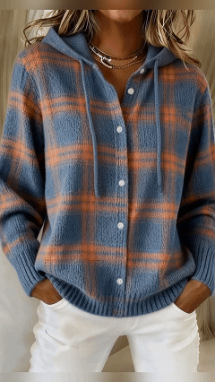 Vintage Soft Check Contrast Hooded Button Knit Cardigan