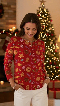 Women's Cute Cookie Print Henley Neck Sweater Top