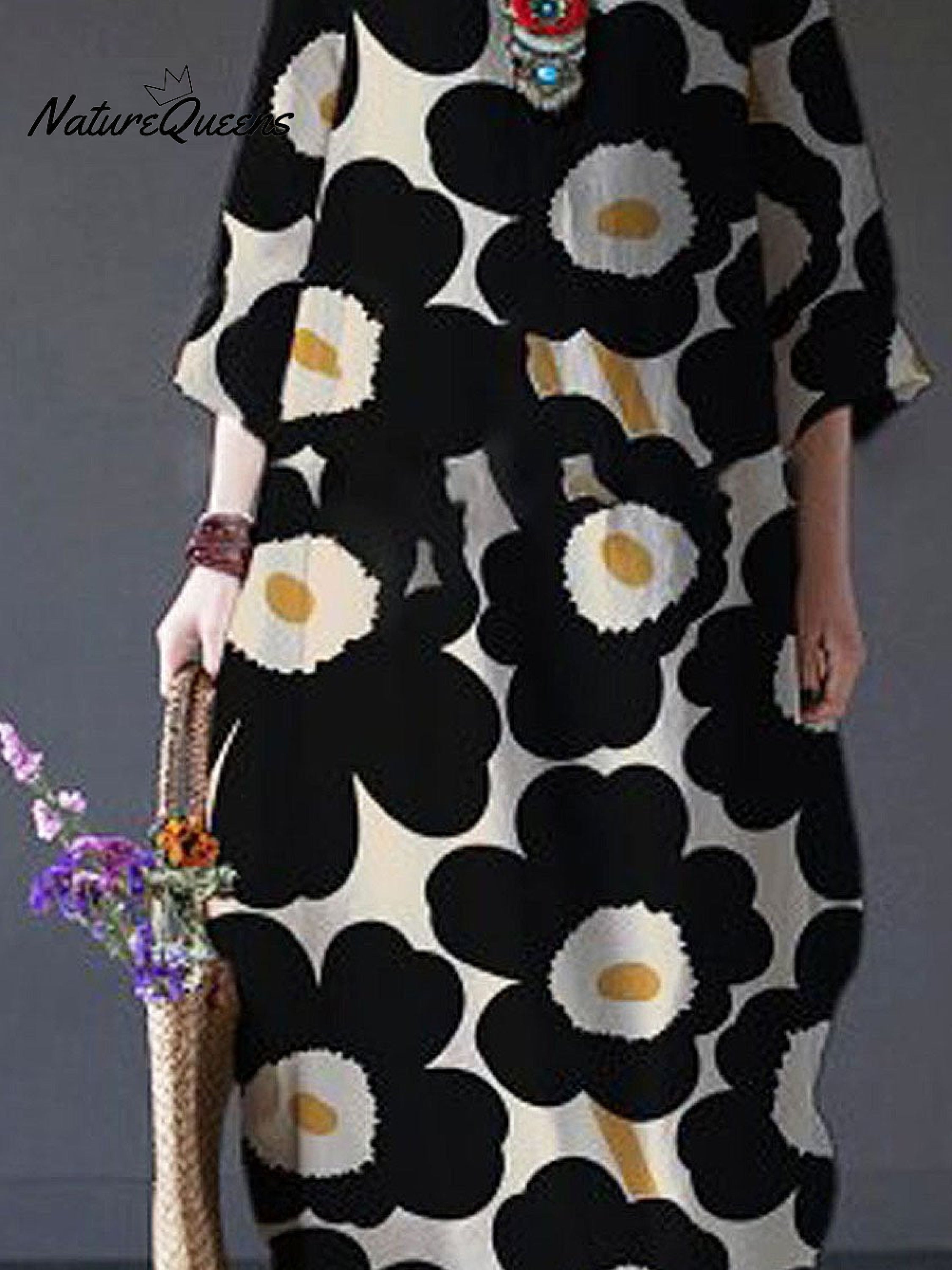 Women's Lovely Floral Art Print Large Size Loose Long Sleeve Casual Dress