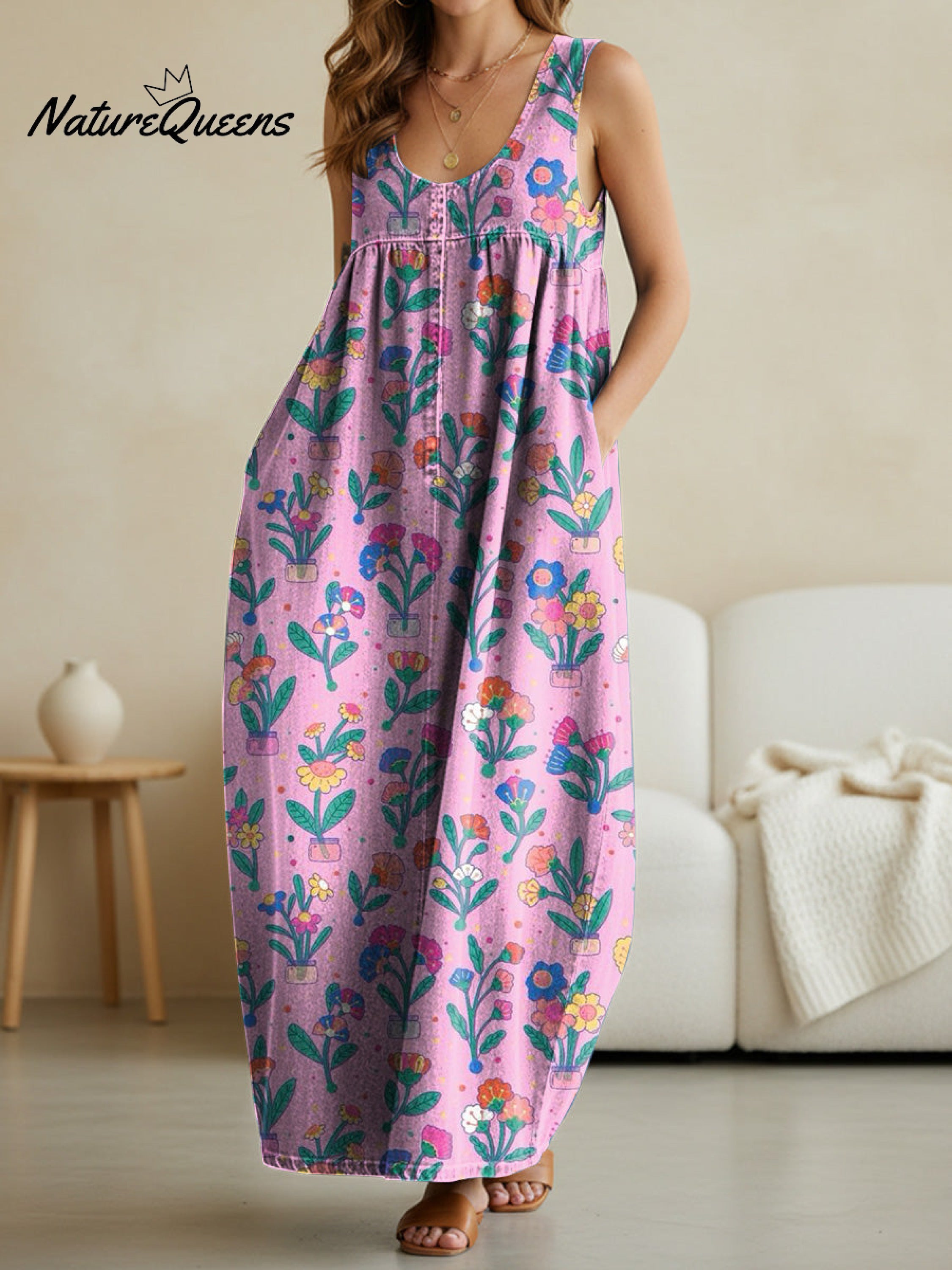 Women's Colorful Floral Art Casual Loose Denim Vest Dress