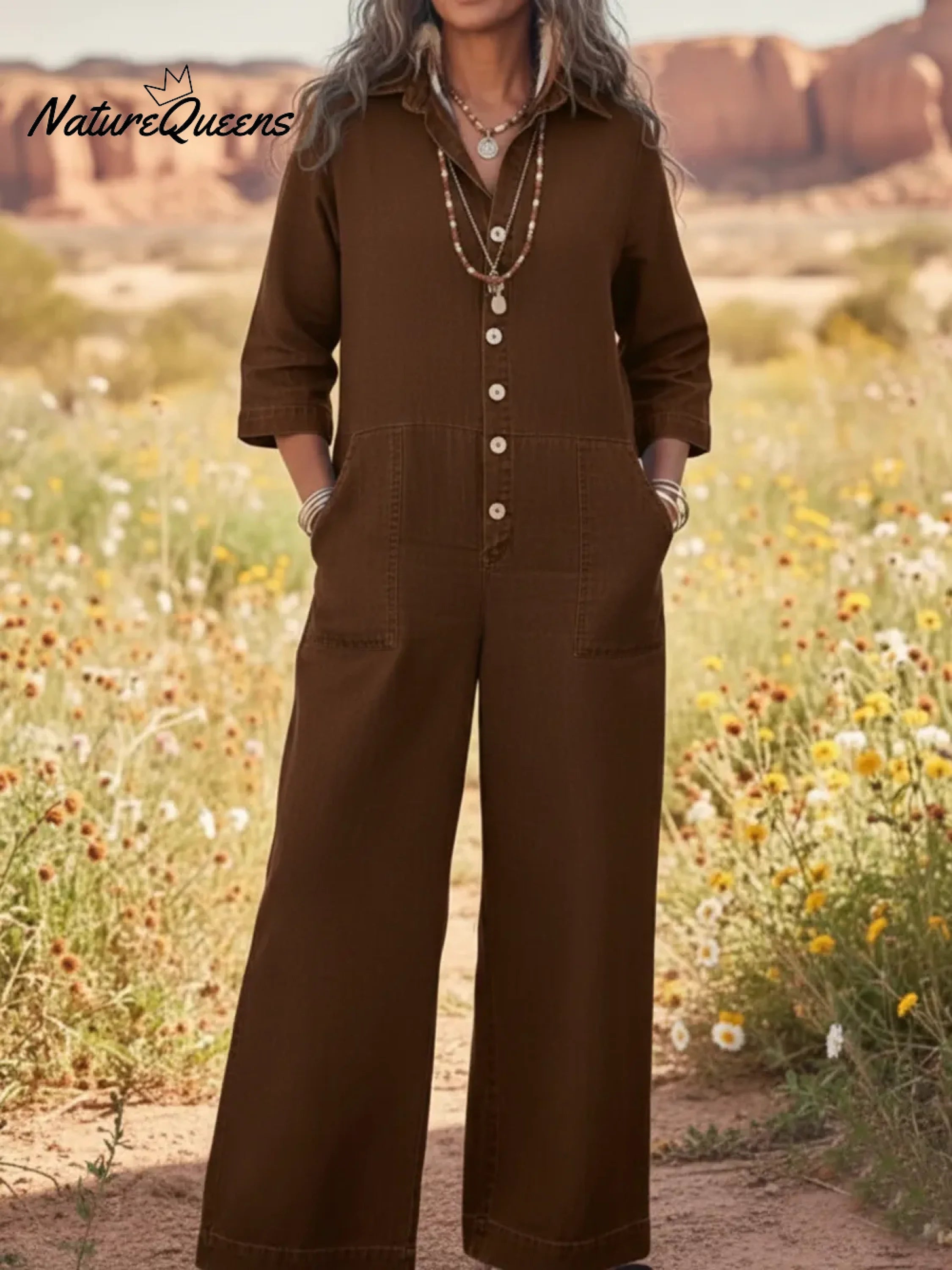 Women's Cozy Loose Collar Button-up Denim Jumpsuit