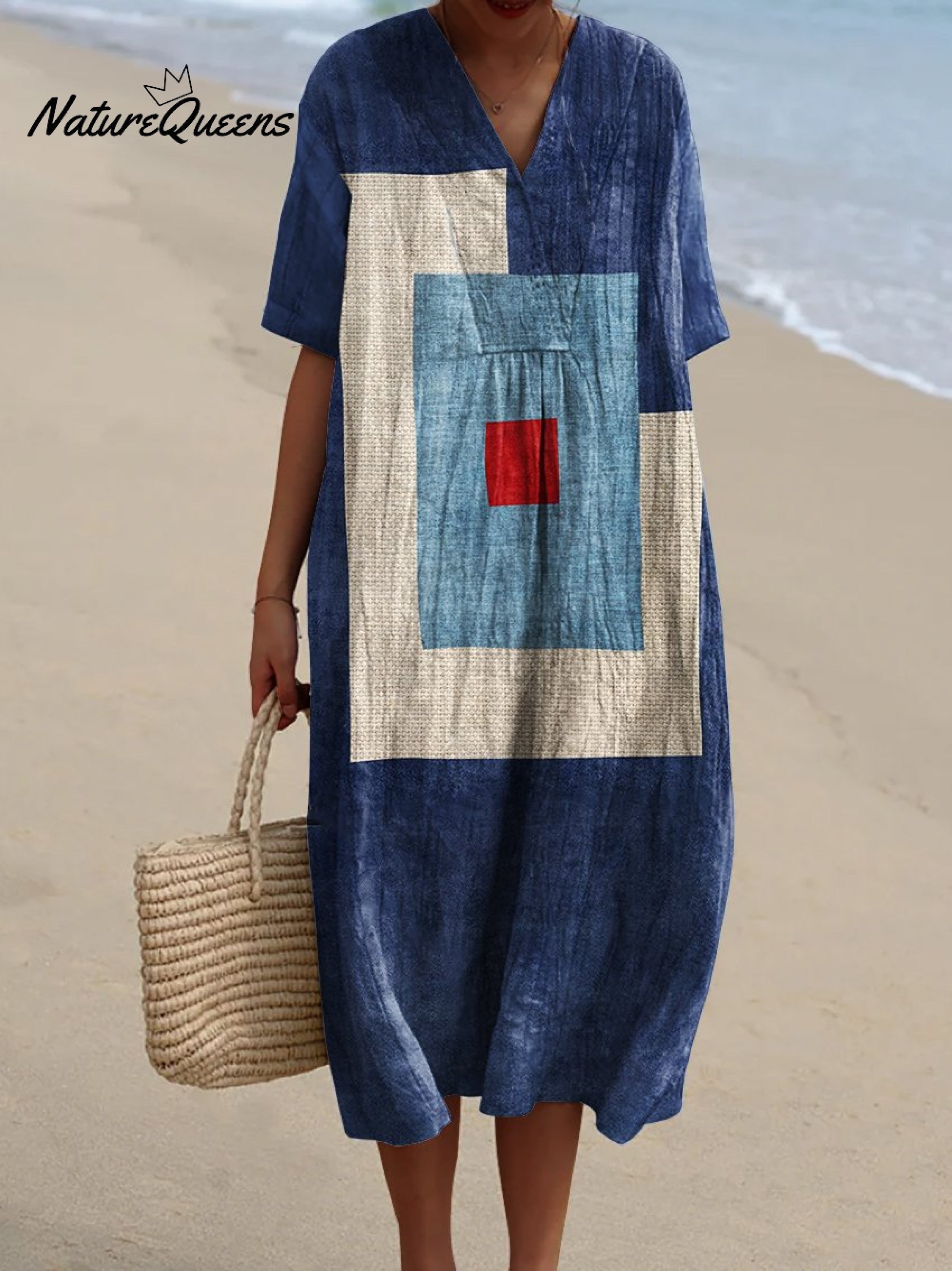 Women's Denim Blue Geometry Watercolor Splash Fluid Art Print Flowy Dress