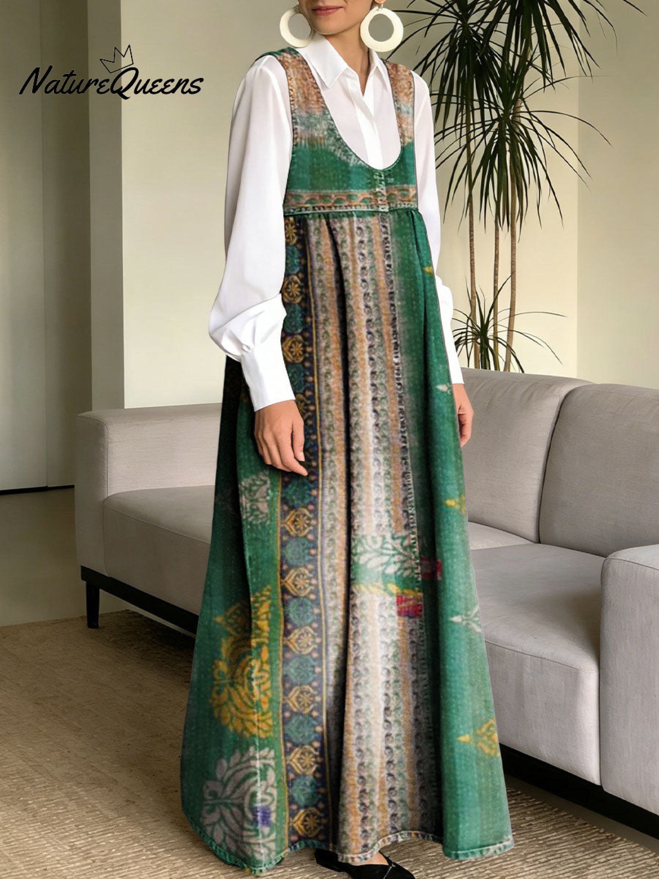 Women's Retro Colorful Flowers Pattern Art Print Casual Cotton Denim Dress
