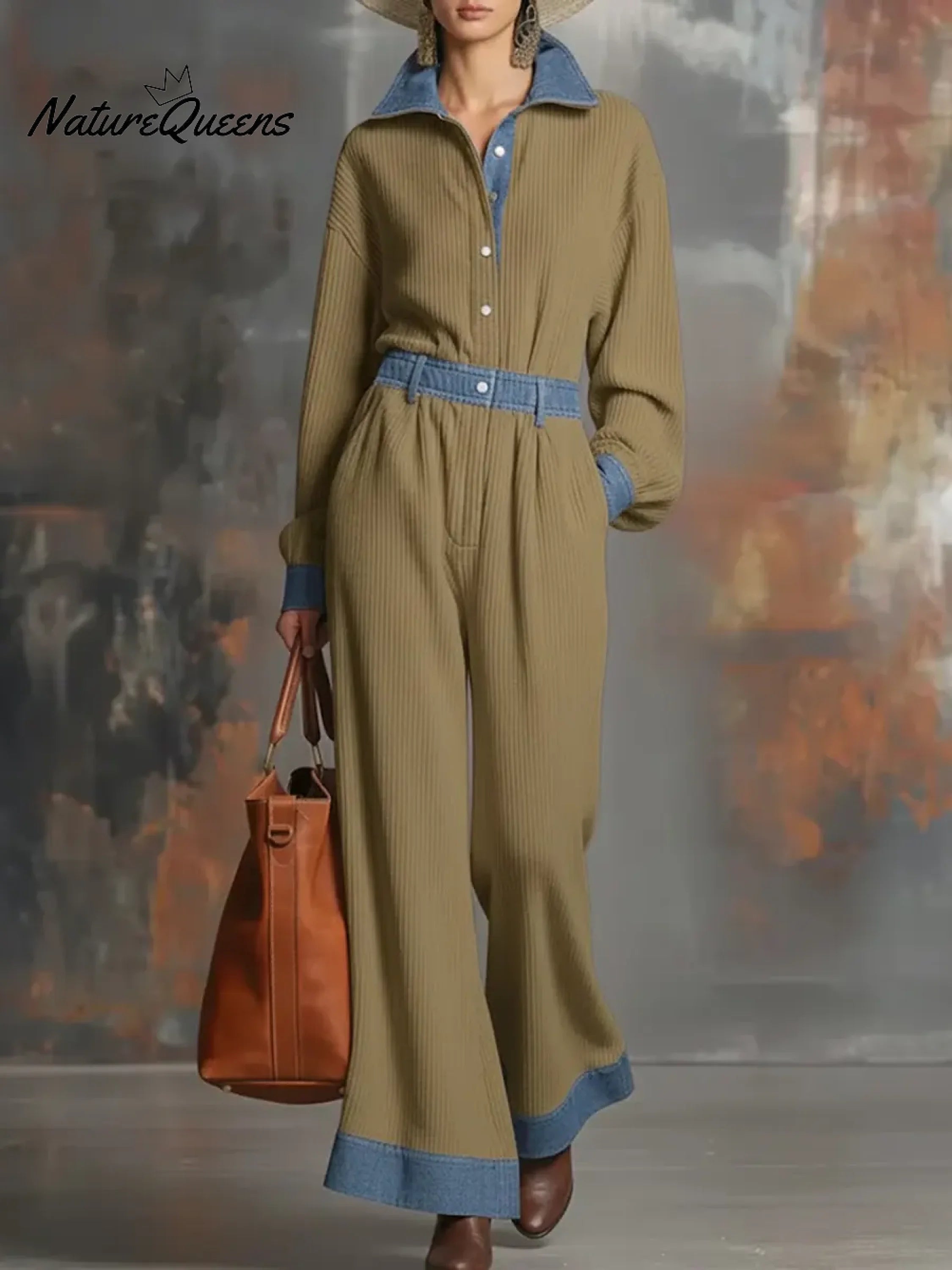 Women's Solid Color Denim Patchwork Shirt Collar Long Sleeve Casual Loose Knit Jumpsuit