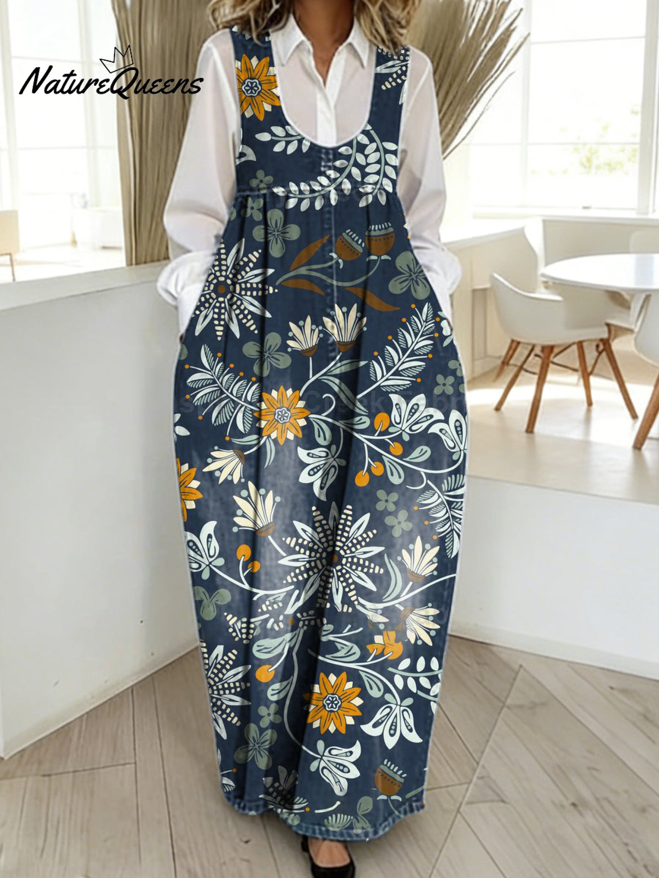 Women's VintageFlowers Art Print Casual Cotton Denim Dress
