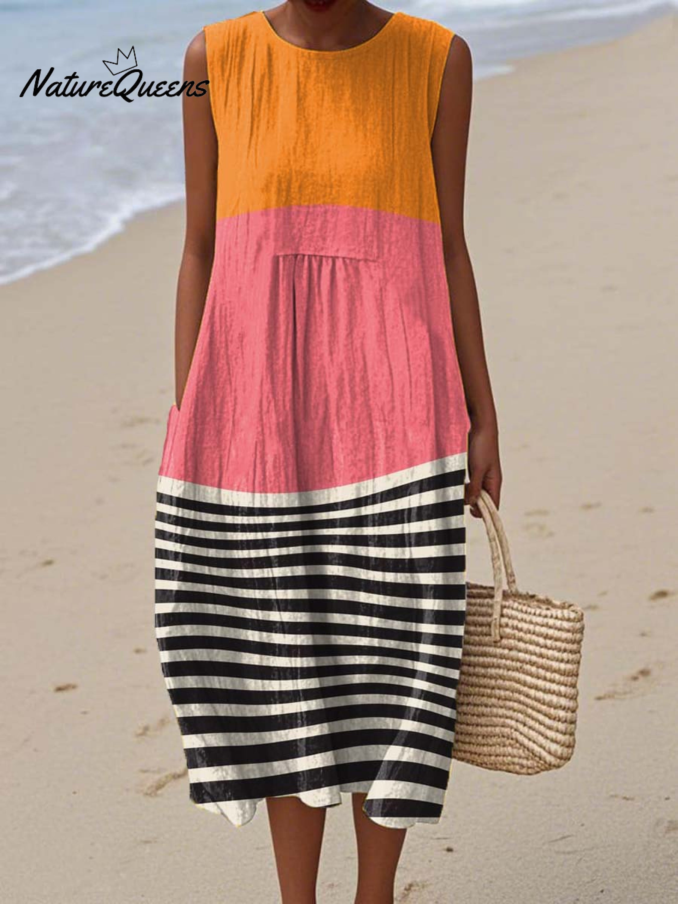 Women's Abstract Line Pattern Art Print Sleeveless Cotton Pocket Wrap Dress