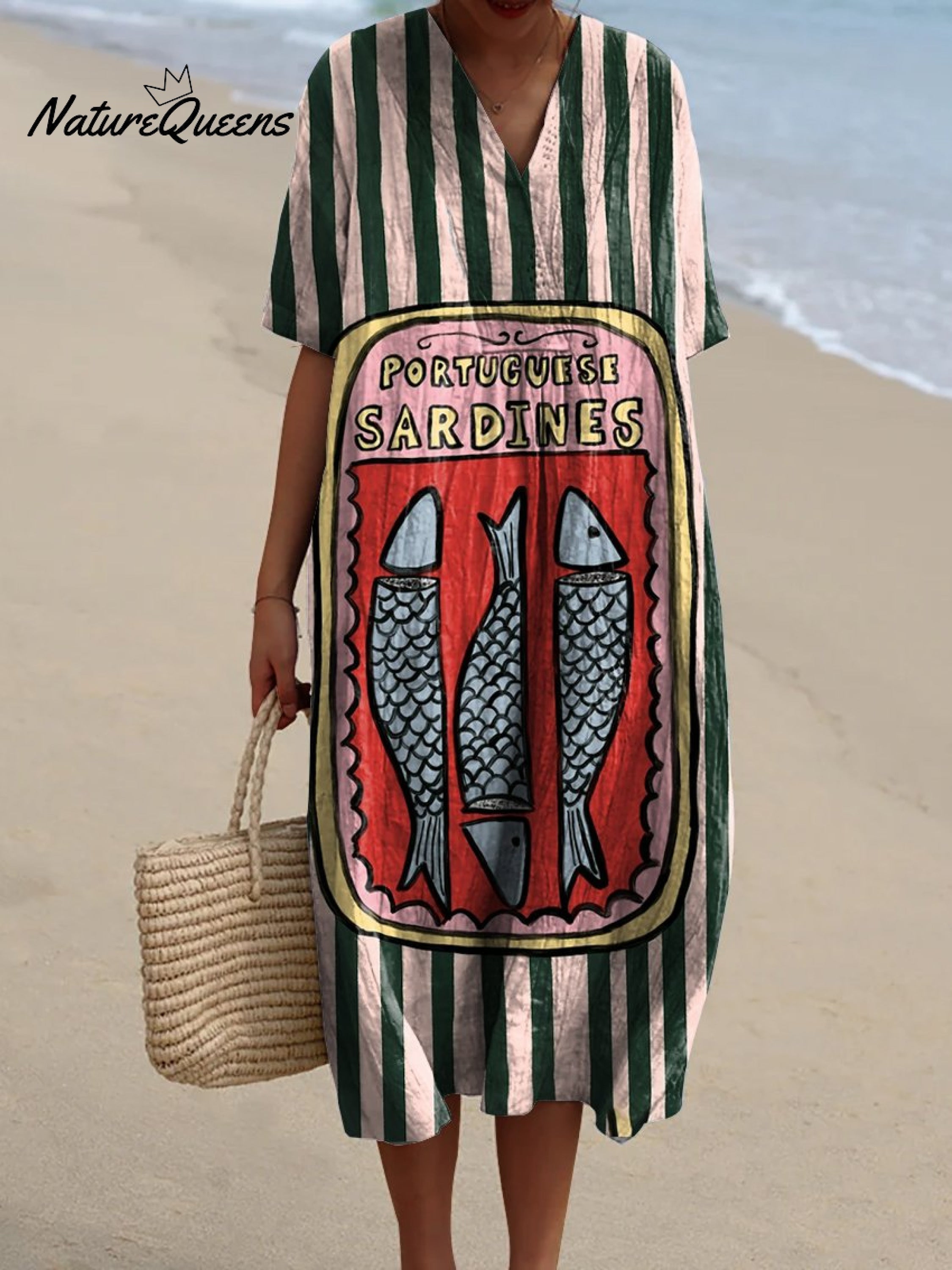 Women's Canned Pink-green Striped Sardines Watercolor Splash Fluid Art Print Flowy Dress
