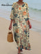 Women's Elegant Orange Floral Print On Green Background Print Pocket Cotton Dress