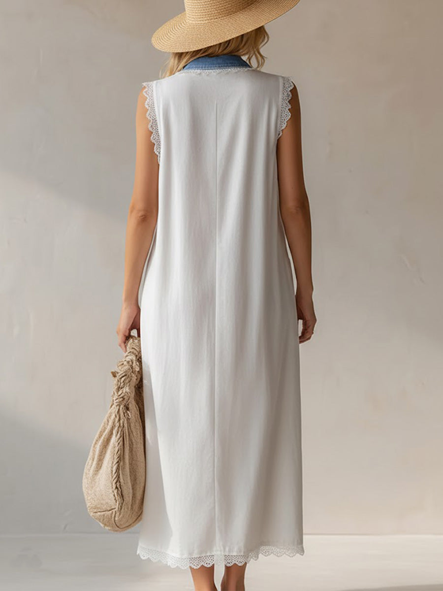 Women's Shirt Collar Sleeveless Casual Loose Denim And Cotton-linen Blend Dress