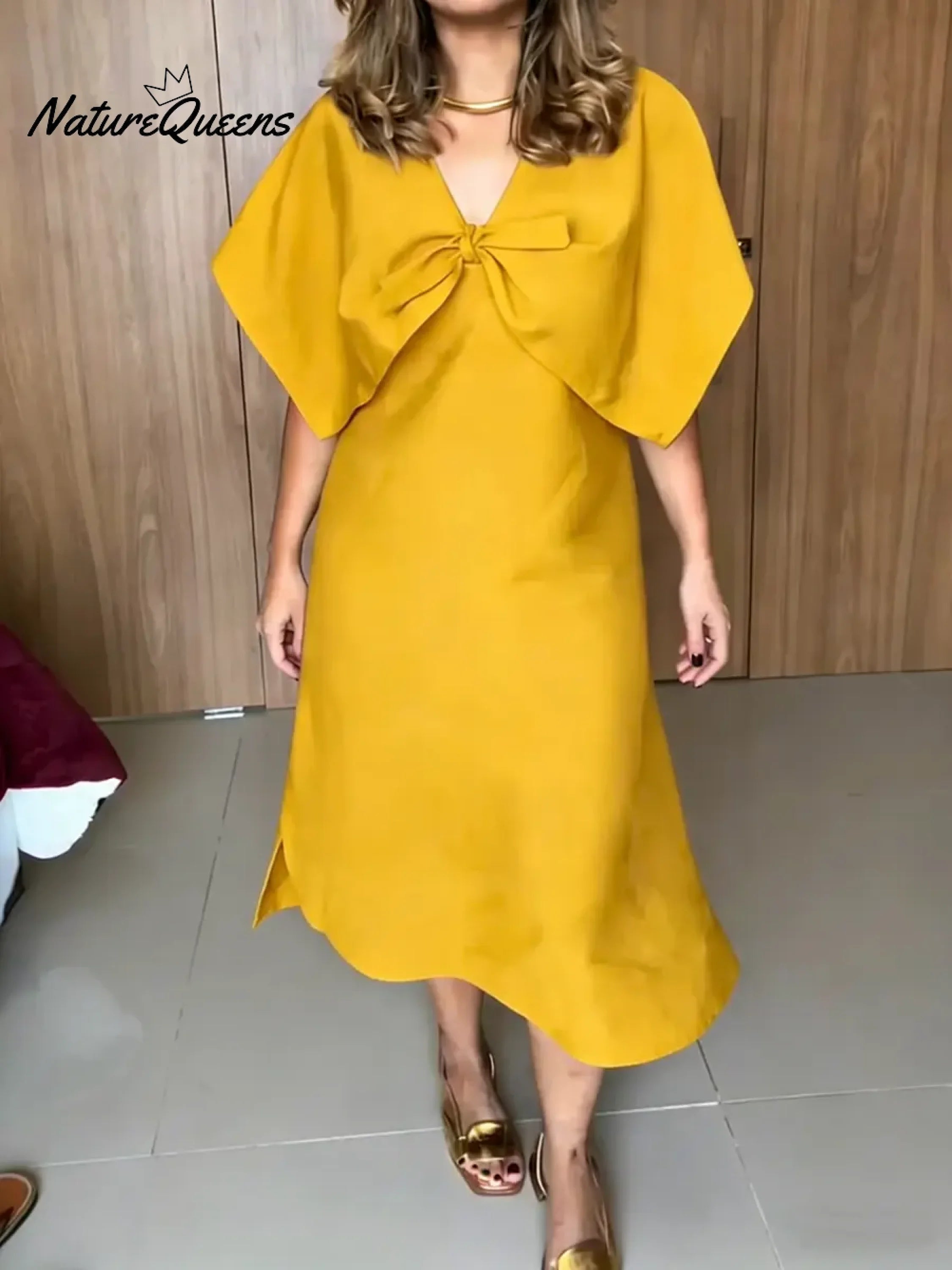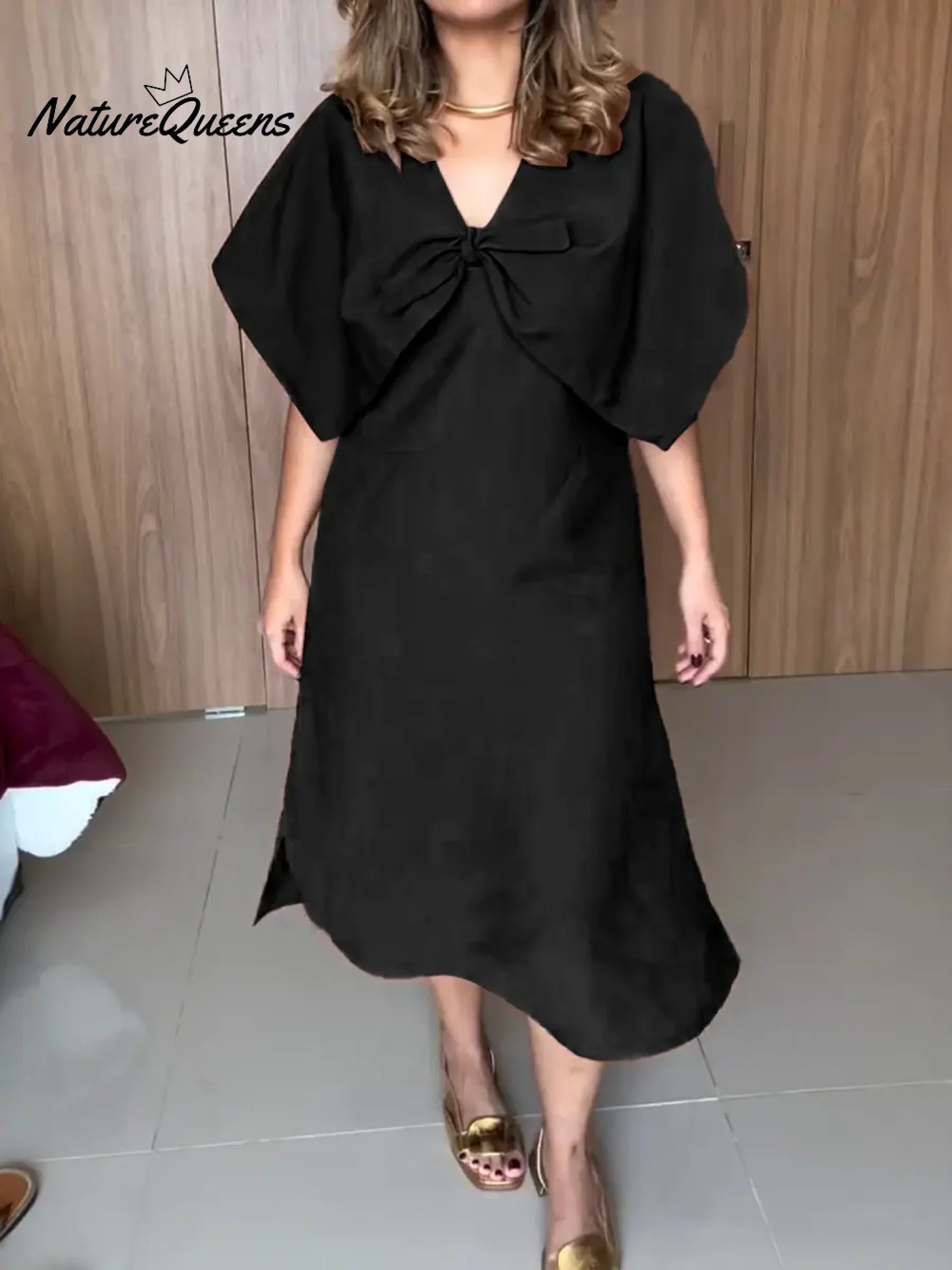 Women's Solid Color V-neck Short-sleeve Casual Loose Cotton Dress