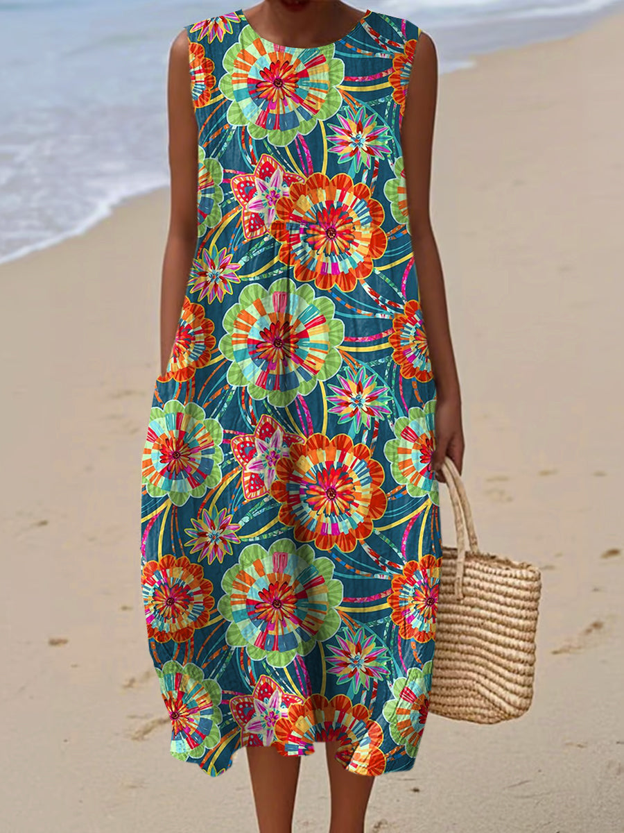 Women's Vintage Flower Art Print Sleeveless Cotton Pocket Wrap Dress
