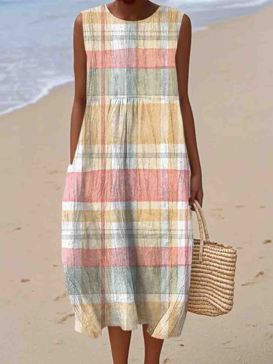 Women's Vintage Plaid Art Print Sleeveless Cotton Pocket Wrap Dress