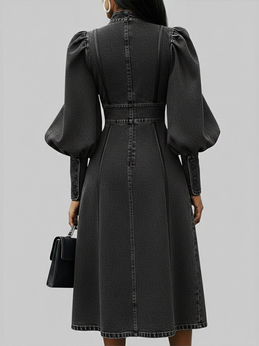 Fashionable Patchwork Leather Lantern Sleeve Denim Dress