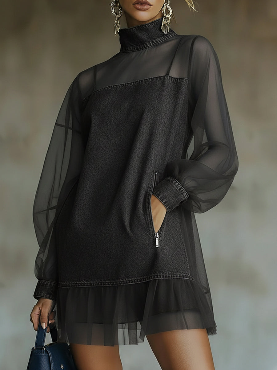 Fashionable Patchwork Organza Denim Mini Dress