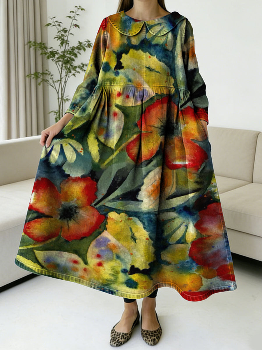 Elegant Floral Decorative Patterns Women's Casual Peter Pan Collar Long Sleeve Dress