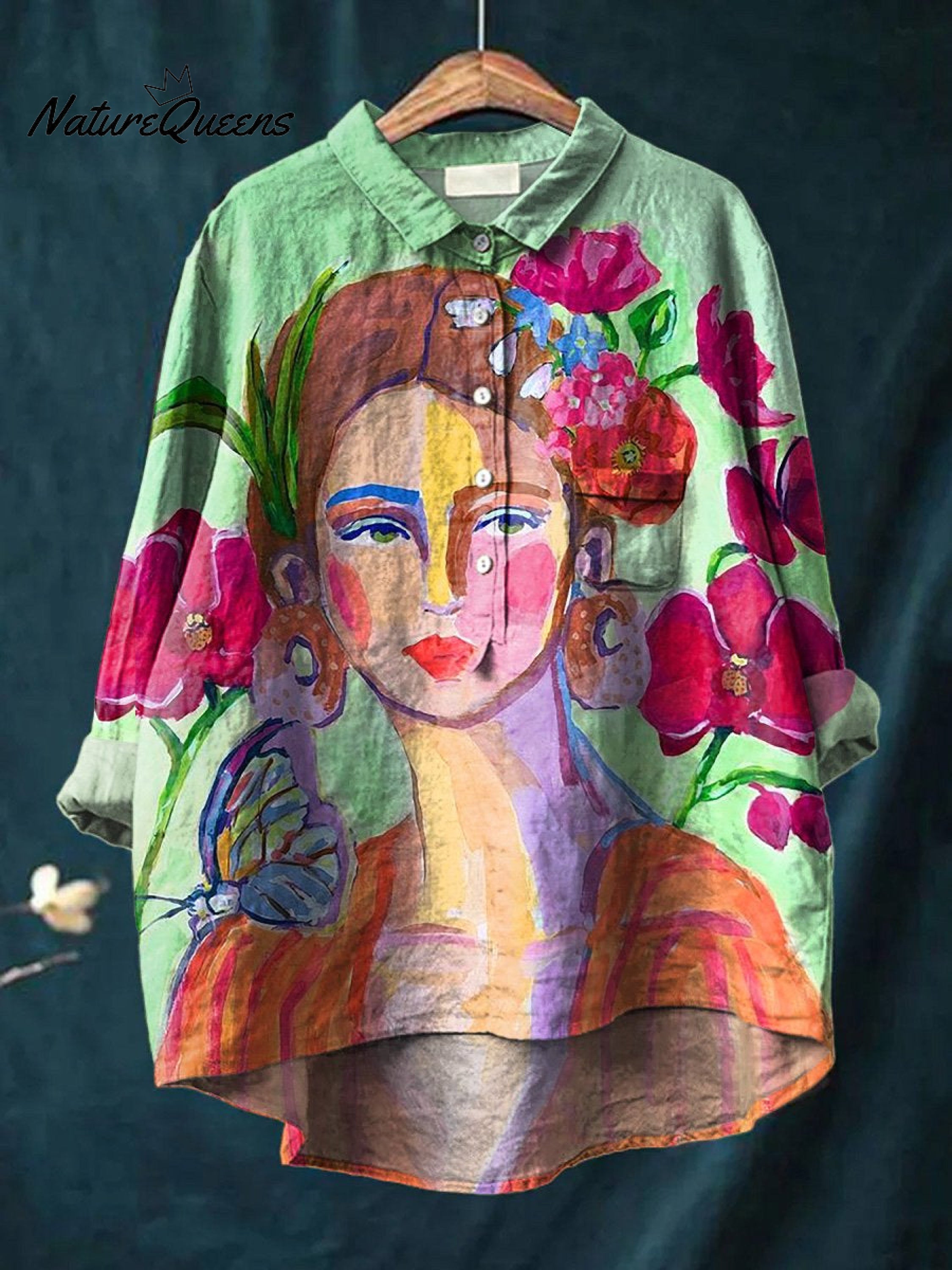 Oil Painting Women's Portrait Art Printed Women's Casual Cotton And Linen Shirt