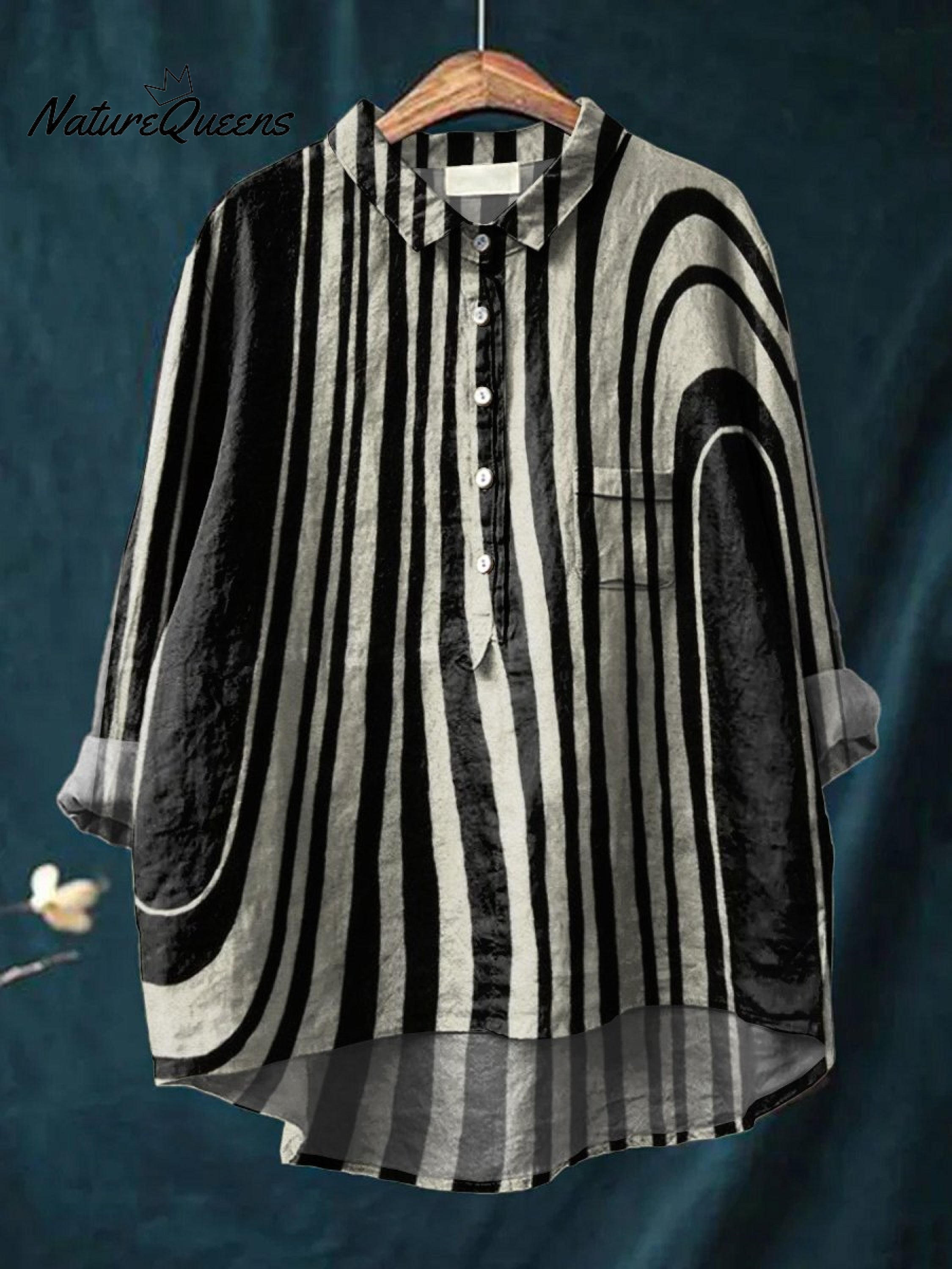 Women's Black and White Ripples Print Casual Cotton And Linen Shirt