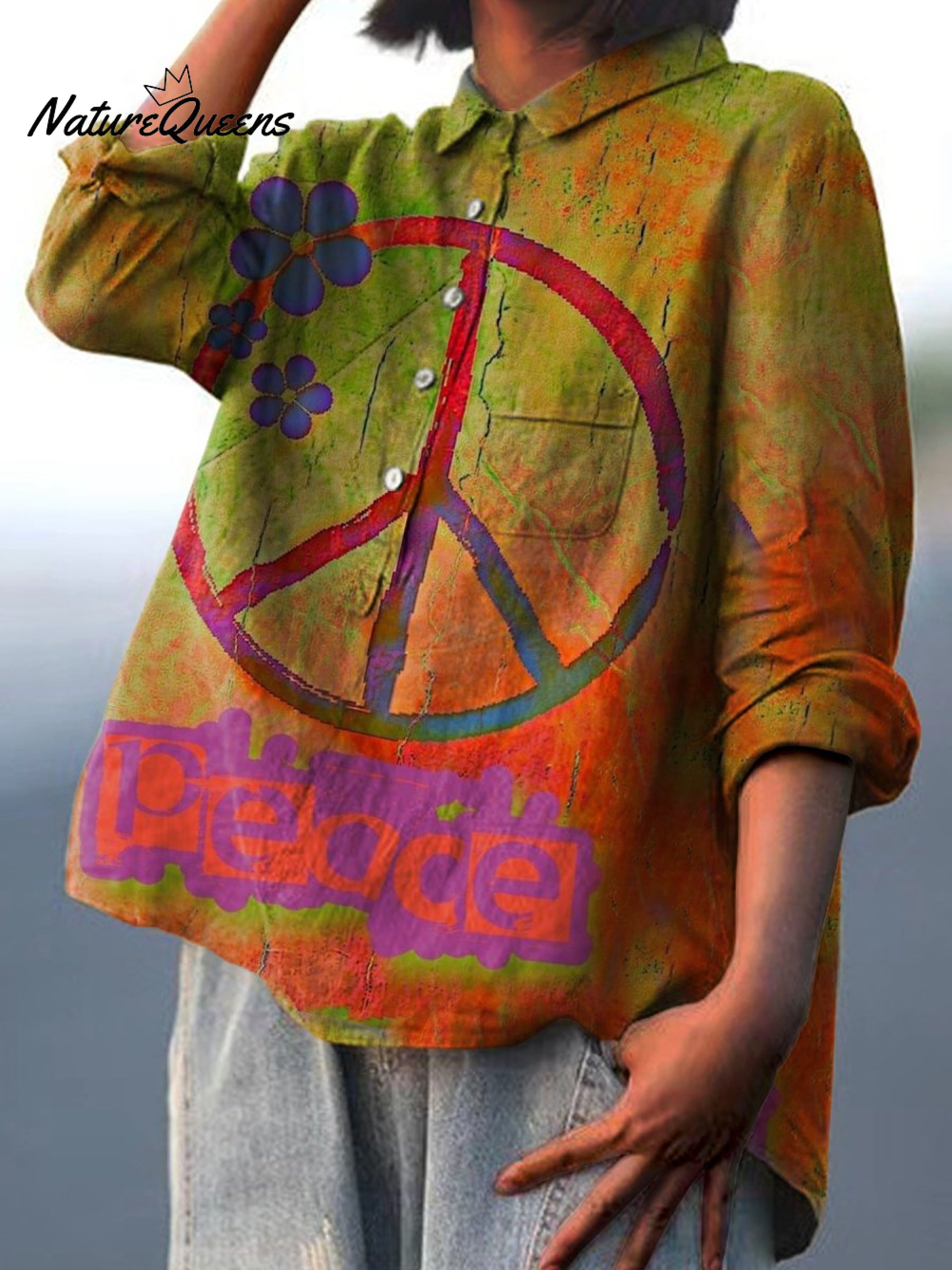 Women's Rainbow Color Retro Gradient Peace Sign Print Casual Cotton And Linen Shirt