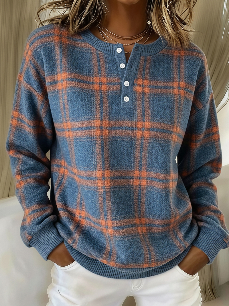 Casual Contrast Plaid Henley Neck Sweatshirt Top
