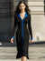 Step into sophisticated style with this striking black ribbed knit midi dress, designed with bold blue contrast accents that elevate its classic silhouette. The form-fitting shape is enhanced by a deep V-neckline and sharp lapel collar in vibrant blue, echoed on the cuffs for a cohesive, polished look.?
