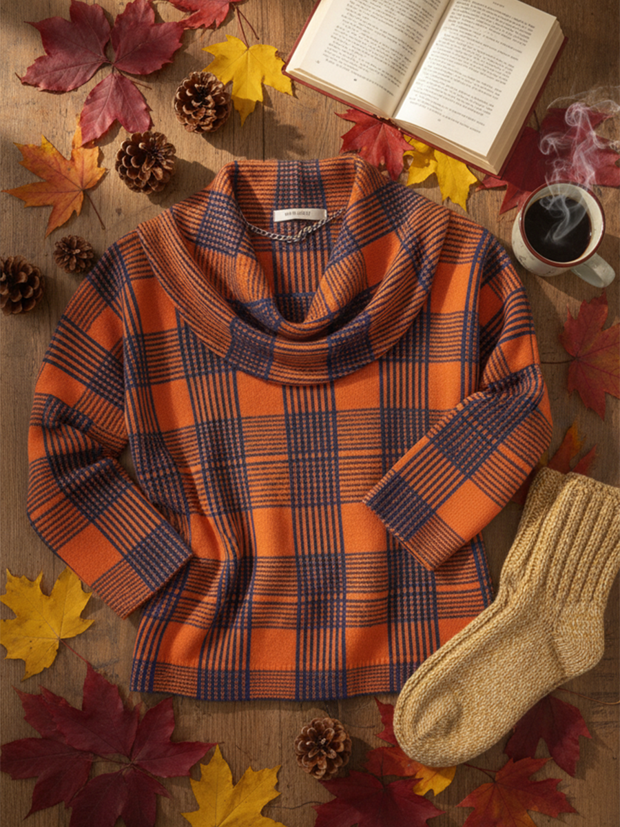 Maple Leaf Orange Check Cowl Neck Sweater Top