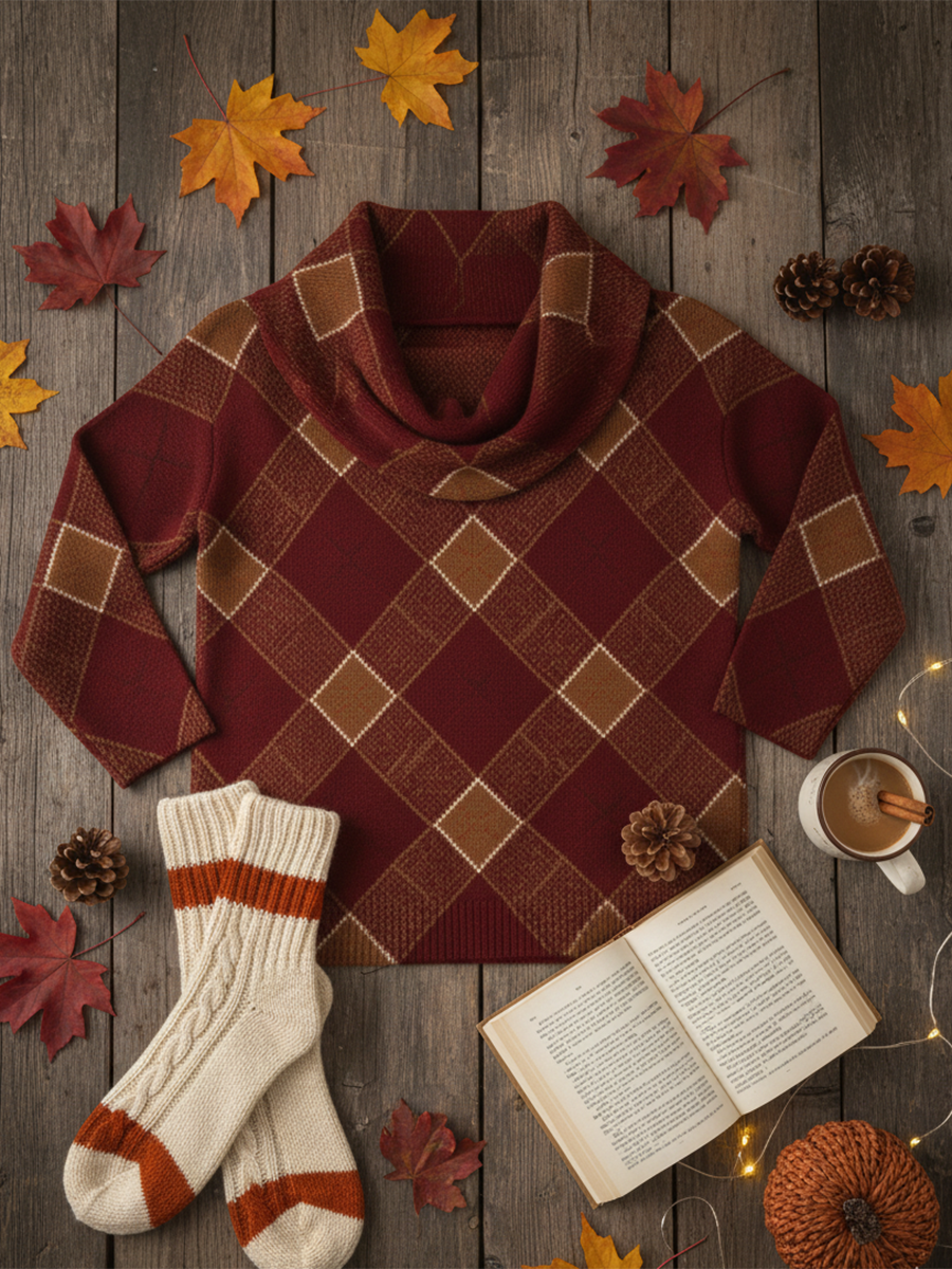 Retro Women's Mellow Red Wine Plaid Cowl Neck Sweater Top