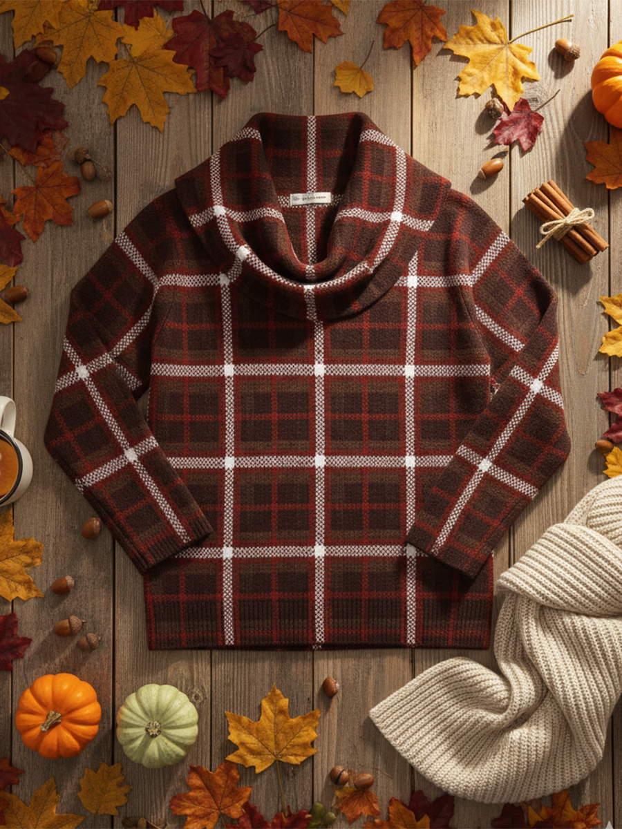 Soft Vintage Red Check Cowl Neck Sweater Top