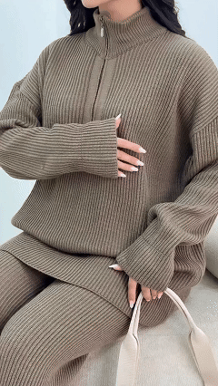 Women's Casual Solid Color Zipper Knit Top Wide Leg Pants Two-Piece Set