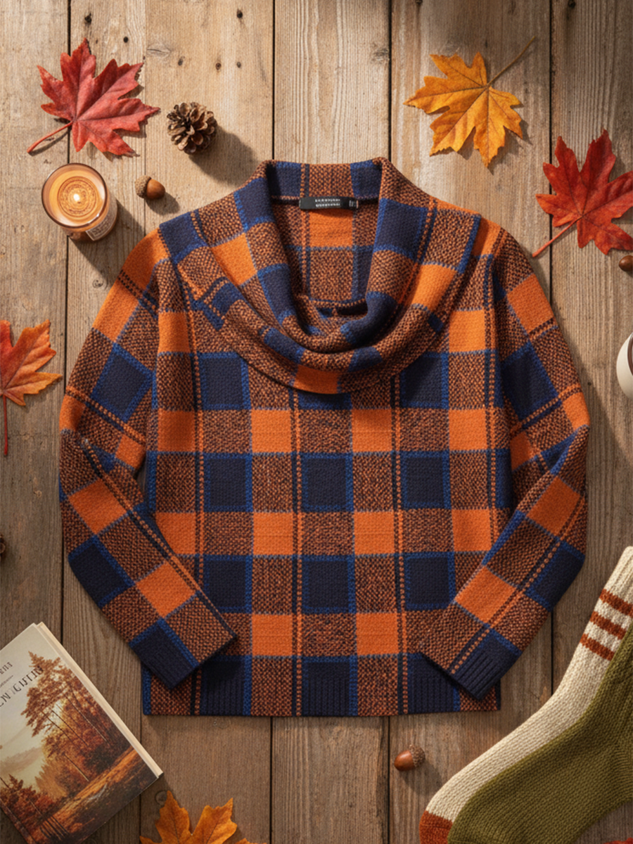 Women's Retro Contrast Color Plaid Cowl Neck Sweater Top