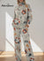 Women's Vintage Flower Art Print Casual Knitted Cotton Top Pants Suit
