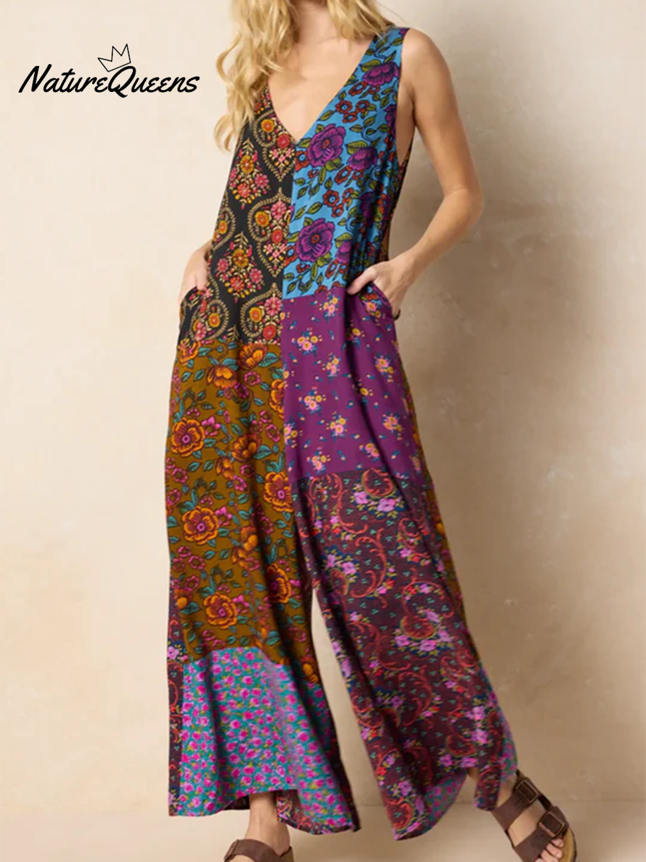 Bohemian Floral Plaid Patchwork Print Loose Jumpsuit