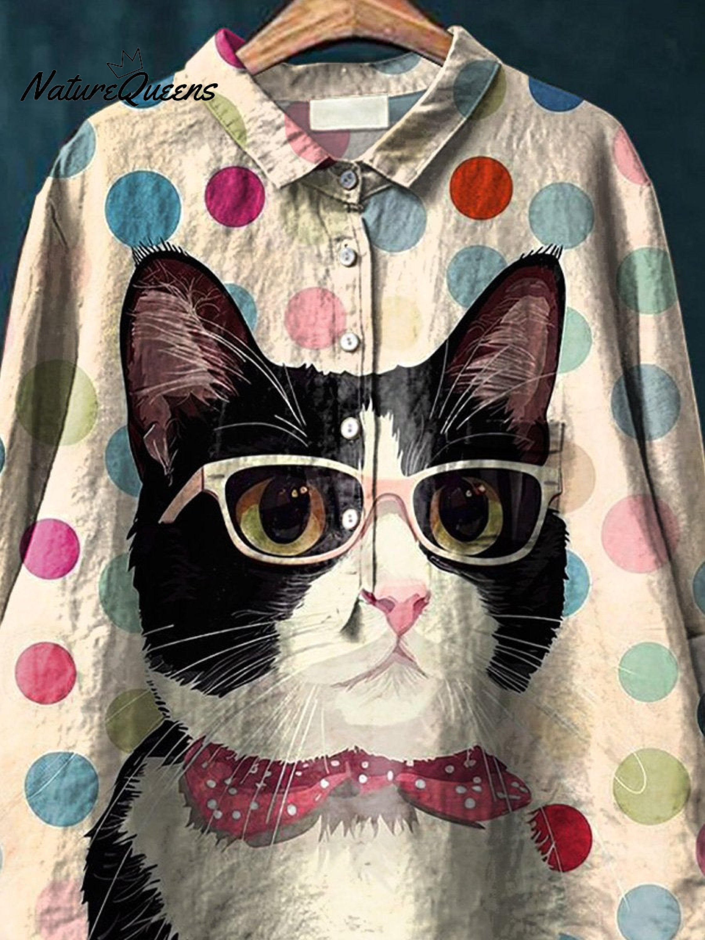 Cat In Glasses Graphic Printed Women's Casual Cotton And Linen Shirt