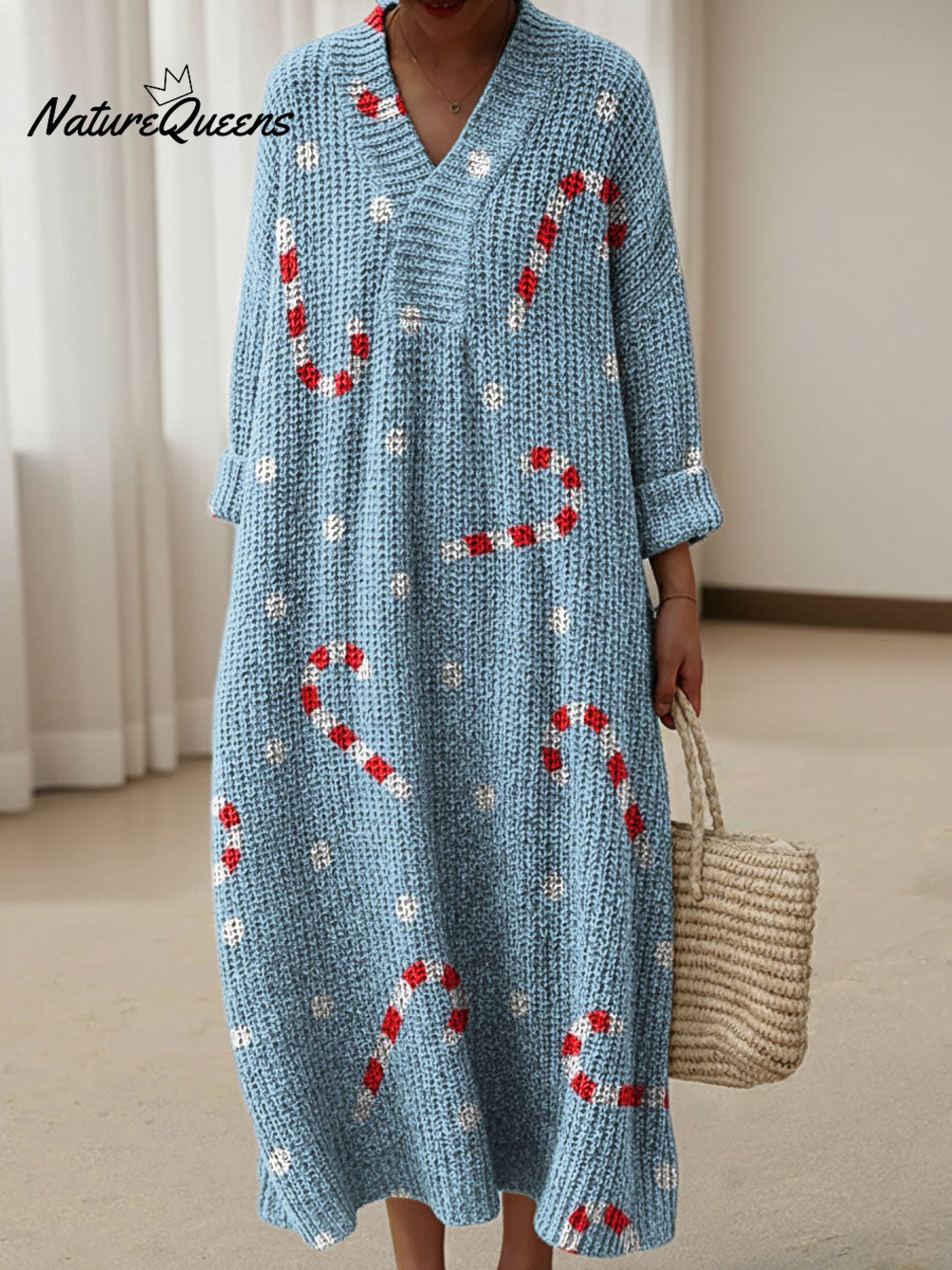 Christmas Candy Cane Decorations Women's Casual V-collar Long Sleeve Dress