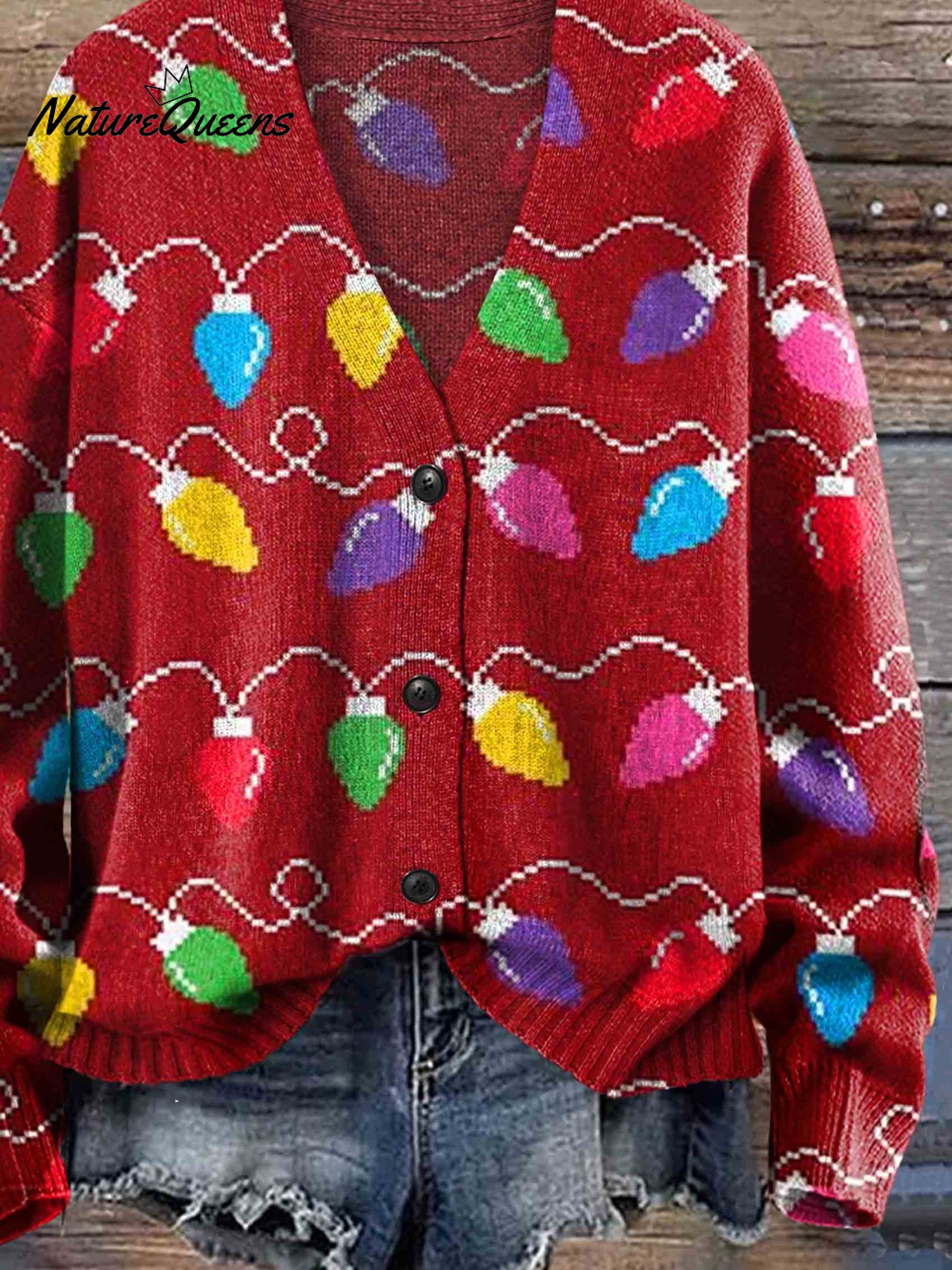 Christmas Lights Print Buttoned Cardigan SweaterChristmas Lights Print Buttoned Cardigan Sweater