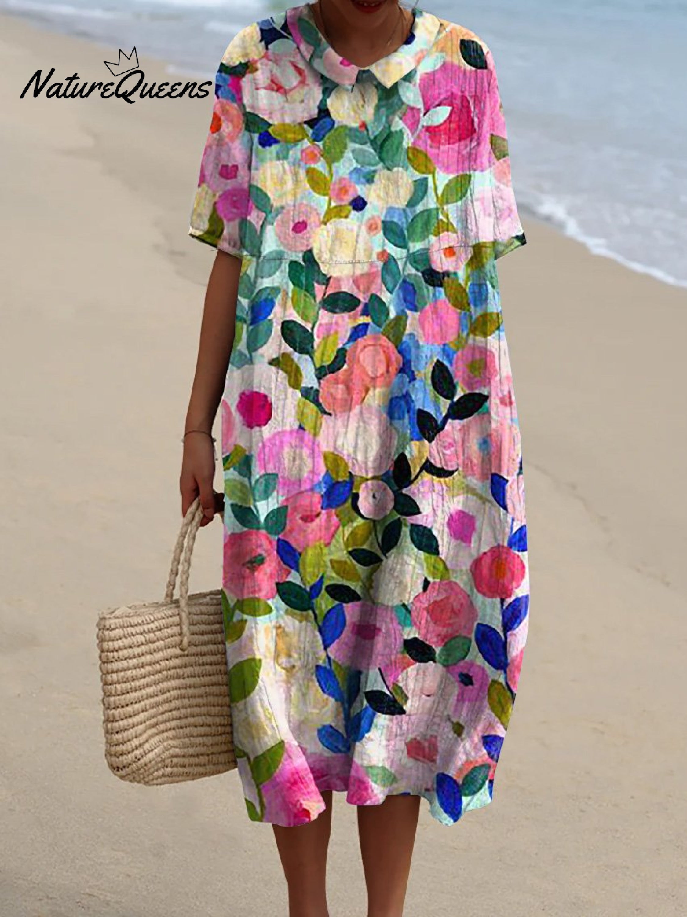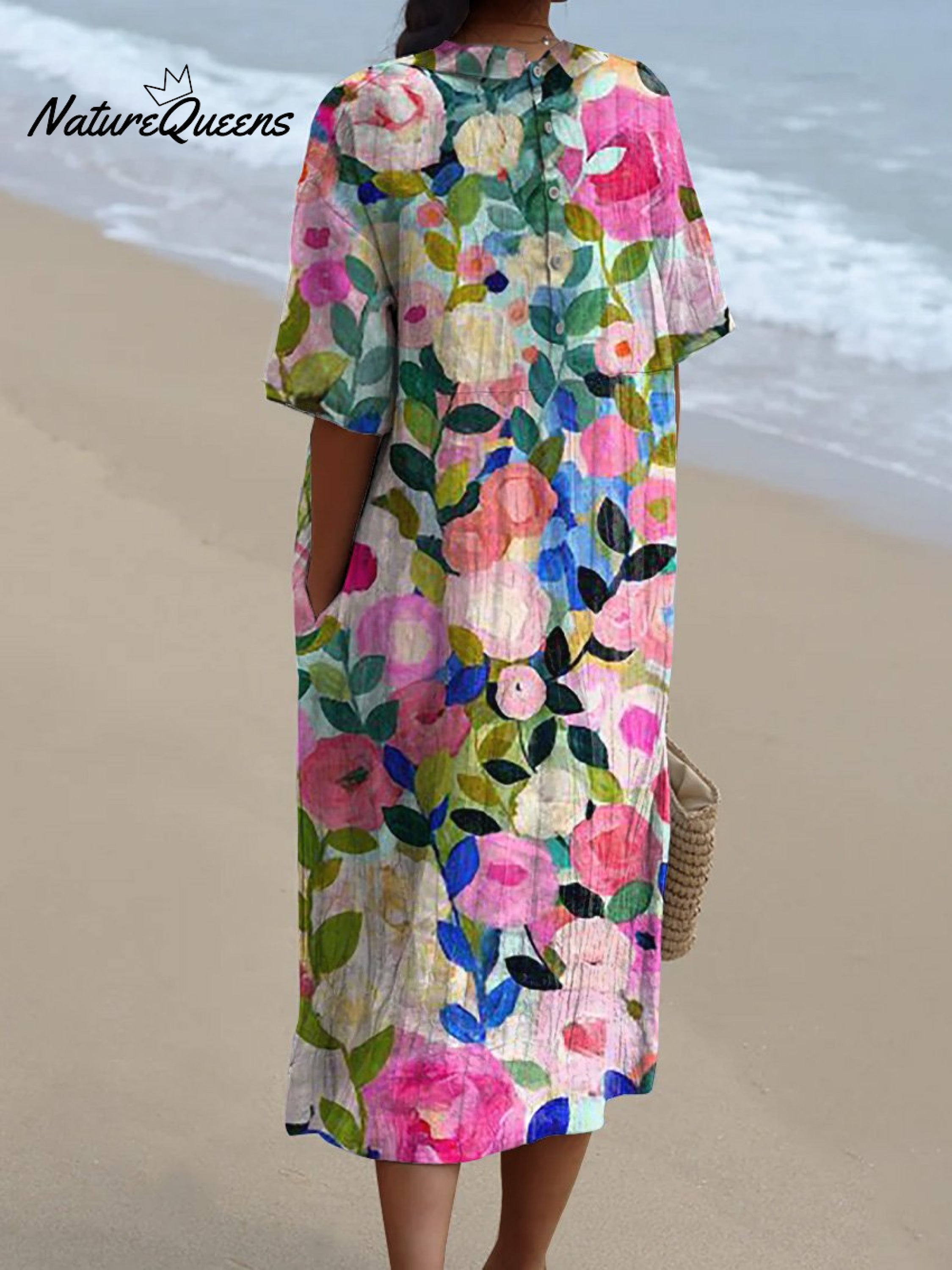 Colorful Spring Floral Garden Printed Women's Pocket Linen Dress (Convertible Dress With Front And Back Option)