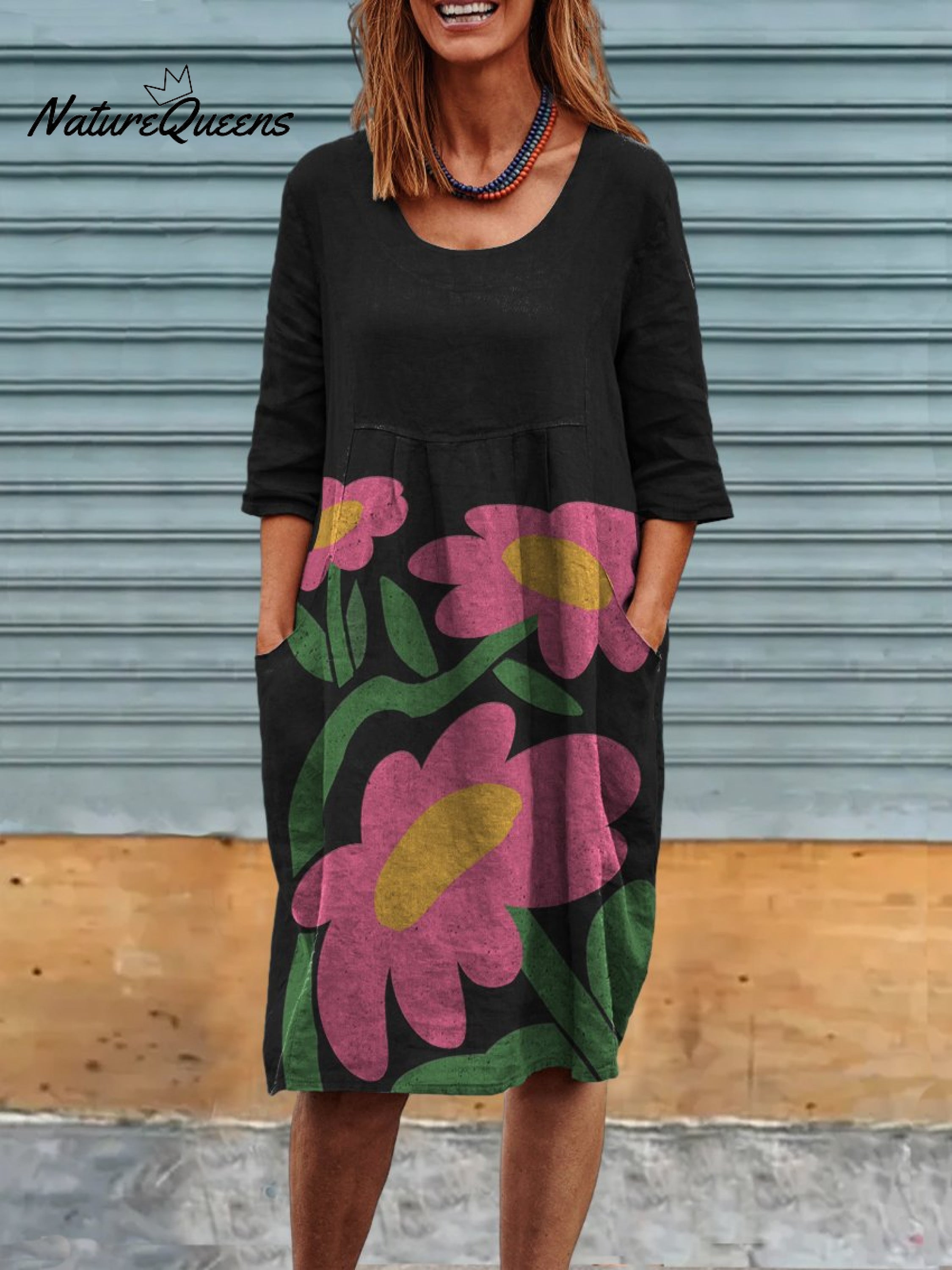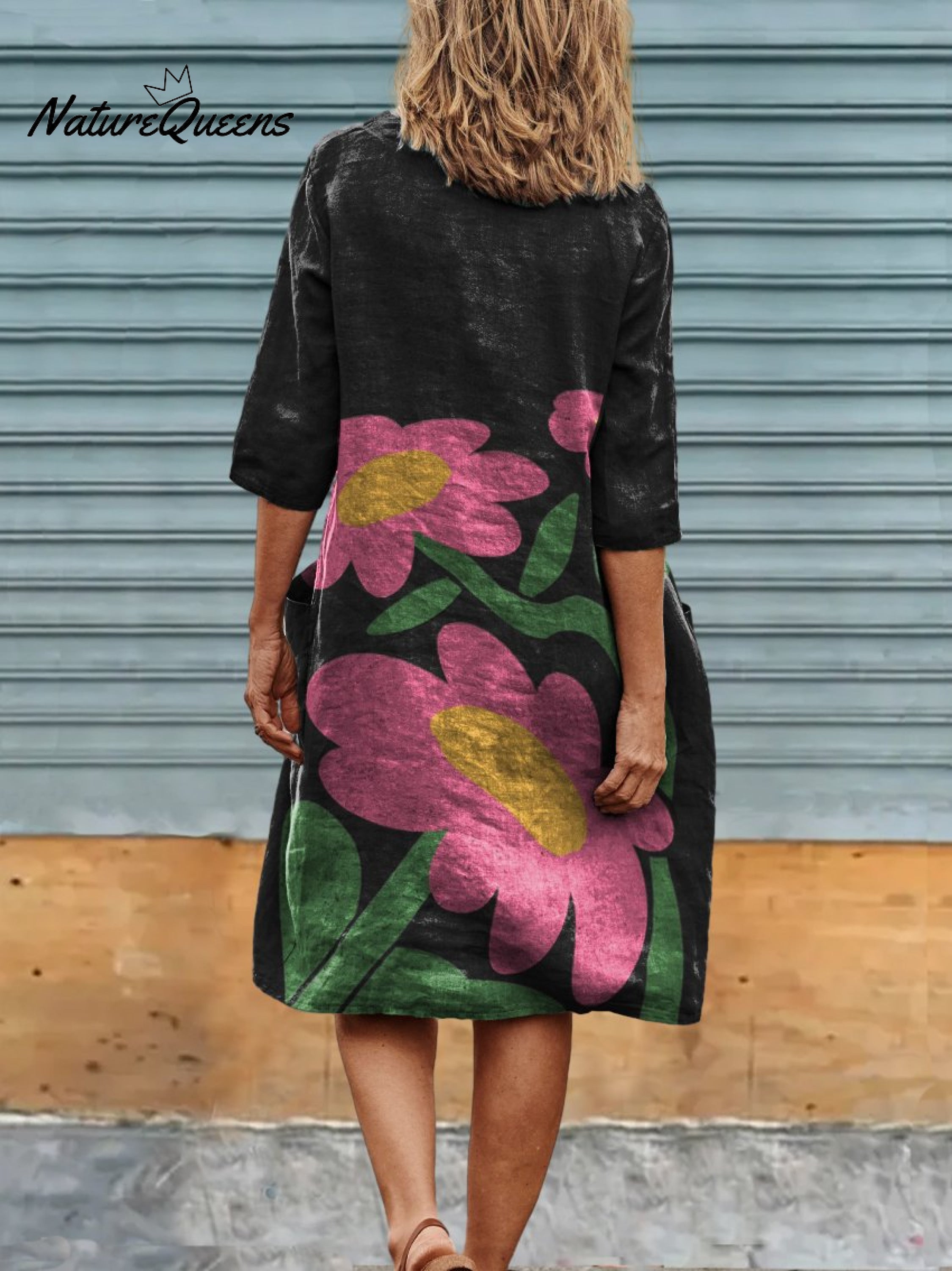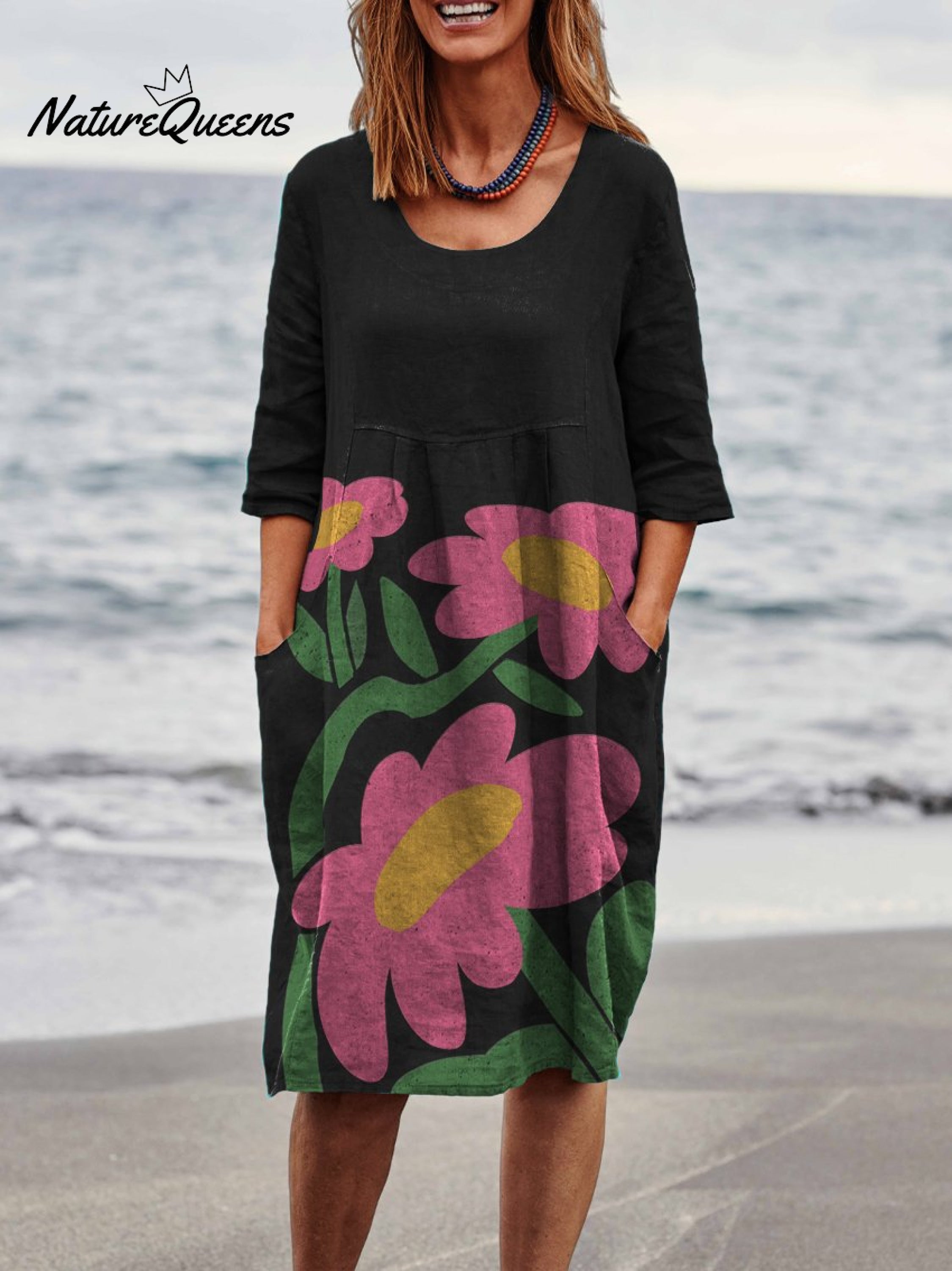 Cute Little Pink Flowers Print Womens Linen Pocket Tunic Dress