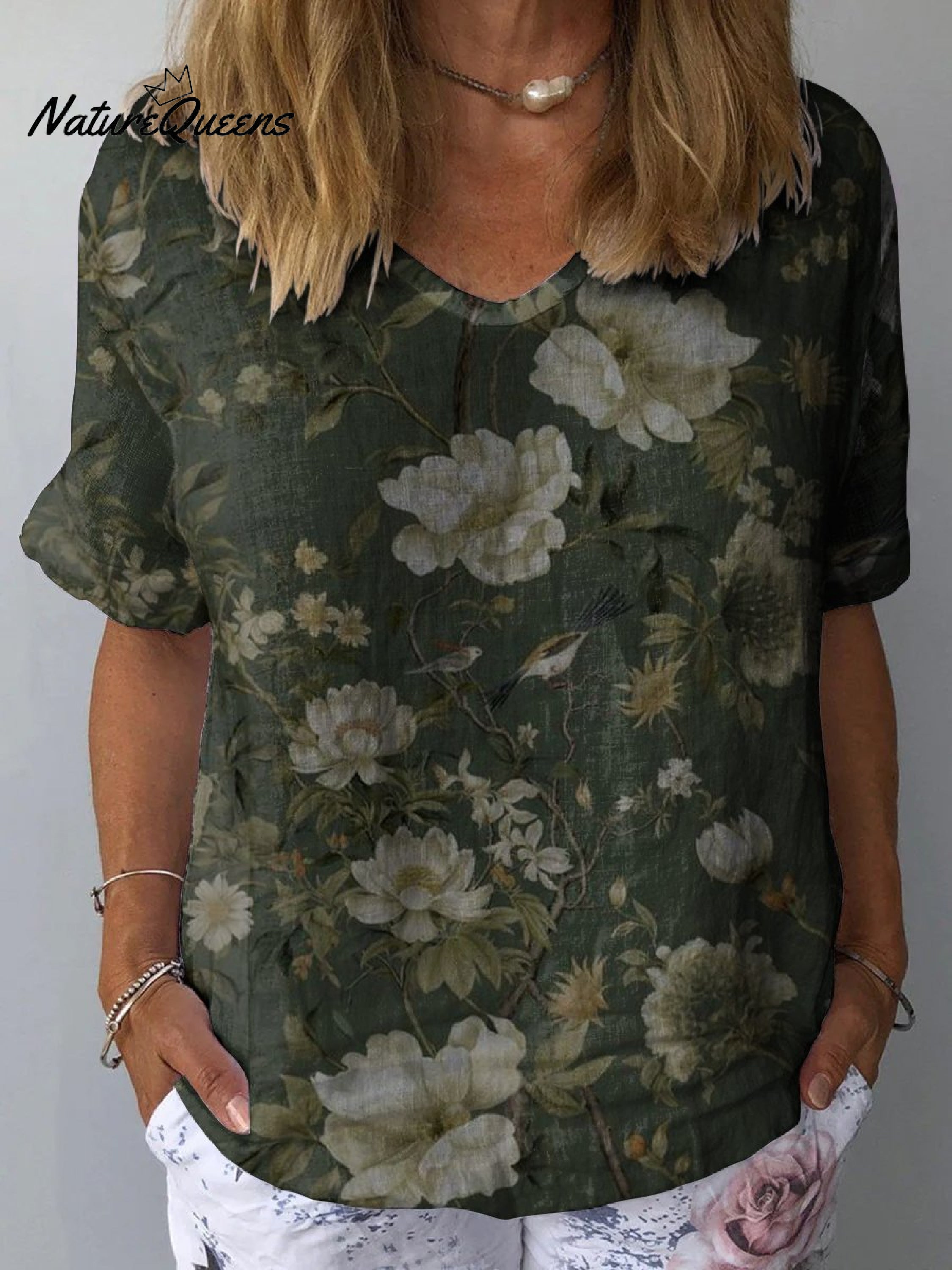 Dark Green Floral Print Women's Print Casual Cotton And Linen Shirt