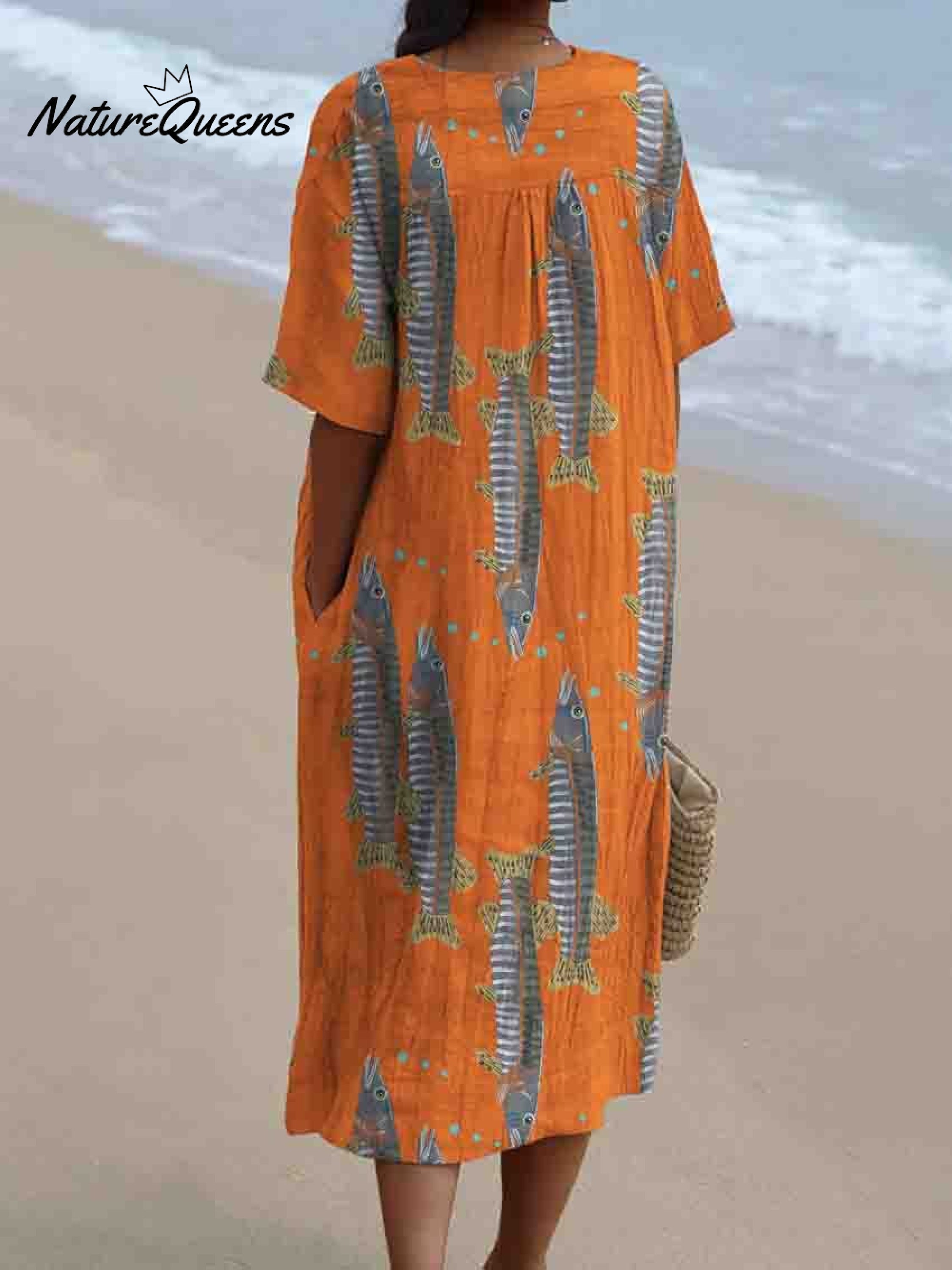 Decorative Pattern of Fish On Orange Bottom Flowy Dress
