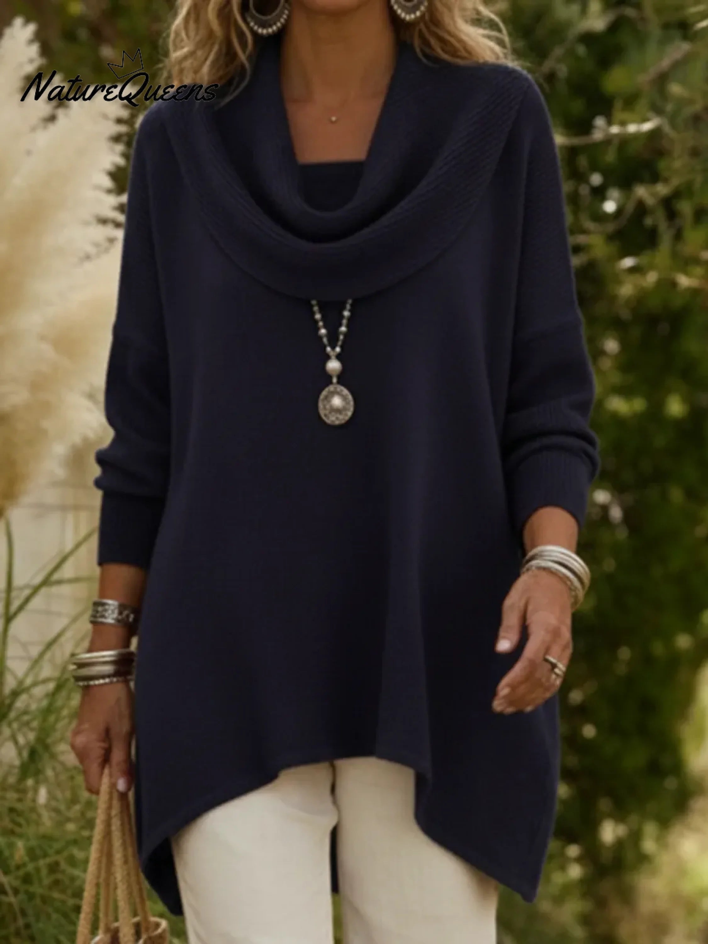 Elegant Draped Collar Irregular Hem Sweater Pullover