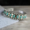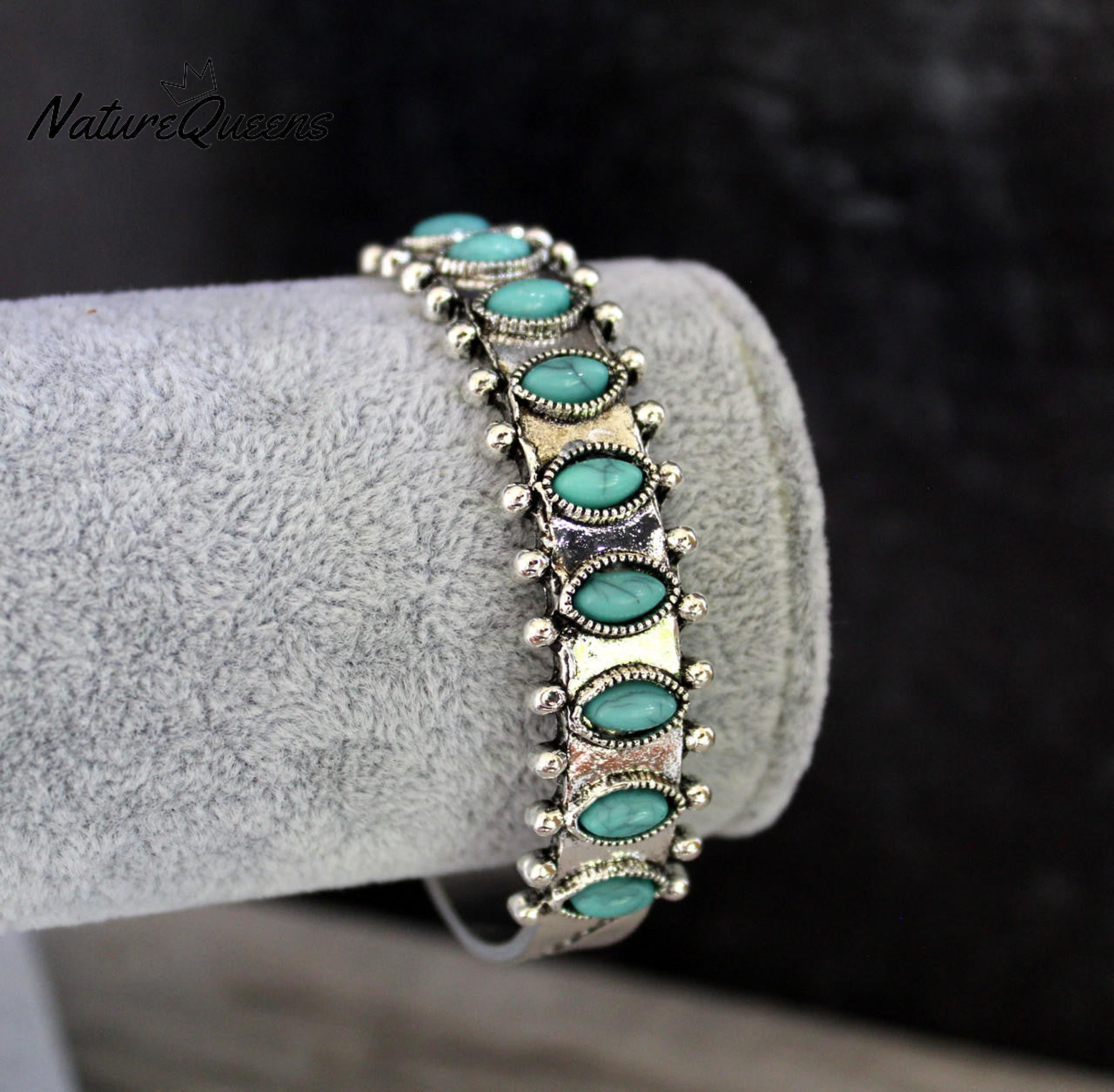 Step into the past with this exquisite, vintage-inspired silver-plated cuff bracelet. Embrace the captivating boho chic vibes as a row of mesmerizing turquoise stones. This truly unique masterpiece effortlessly elevates any ensemble, infusing it with an undeniable touch of elegance. Get ready to turn heads, make a statement, and leave a lasting impression with this enchanting piece!
