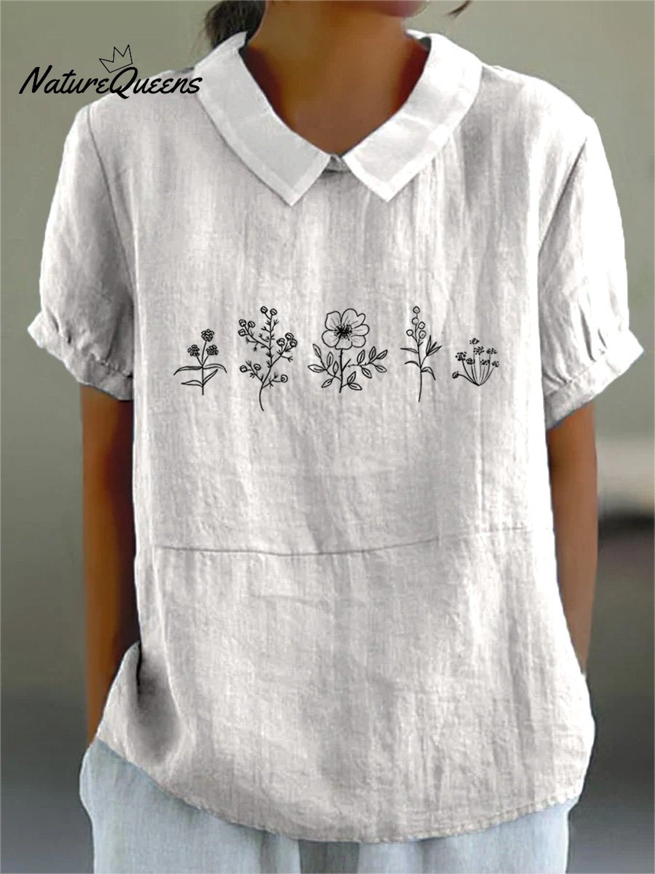 Line Drawing Floral Bush Printed Women's Casual Cotton And Linen Shirt