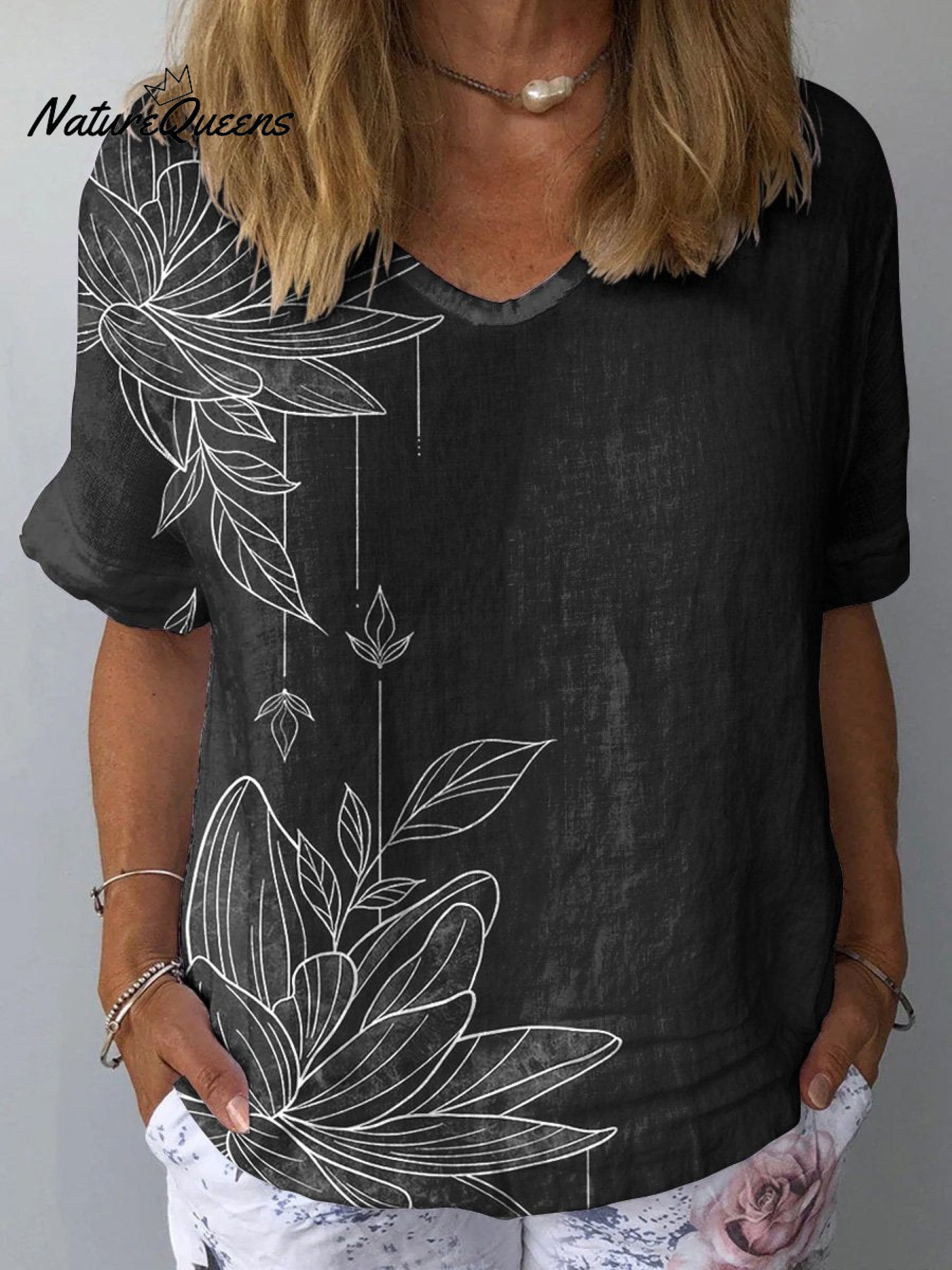 Line Drawing Water Lily Art Printed Women's Casual Cotton And Linen Shirt