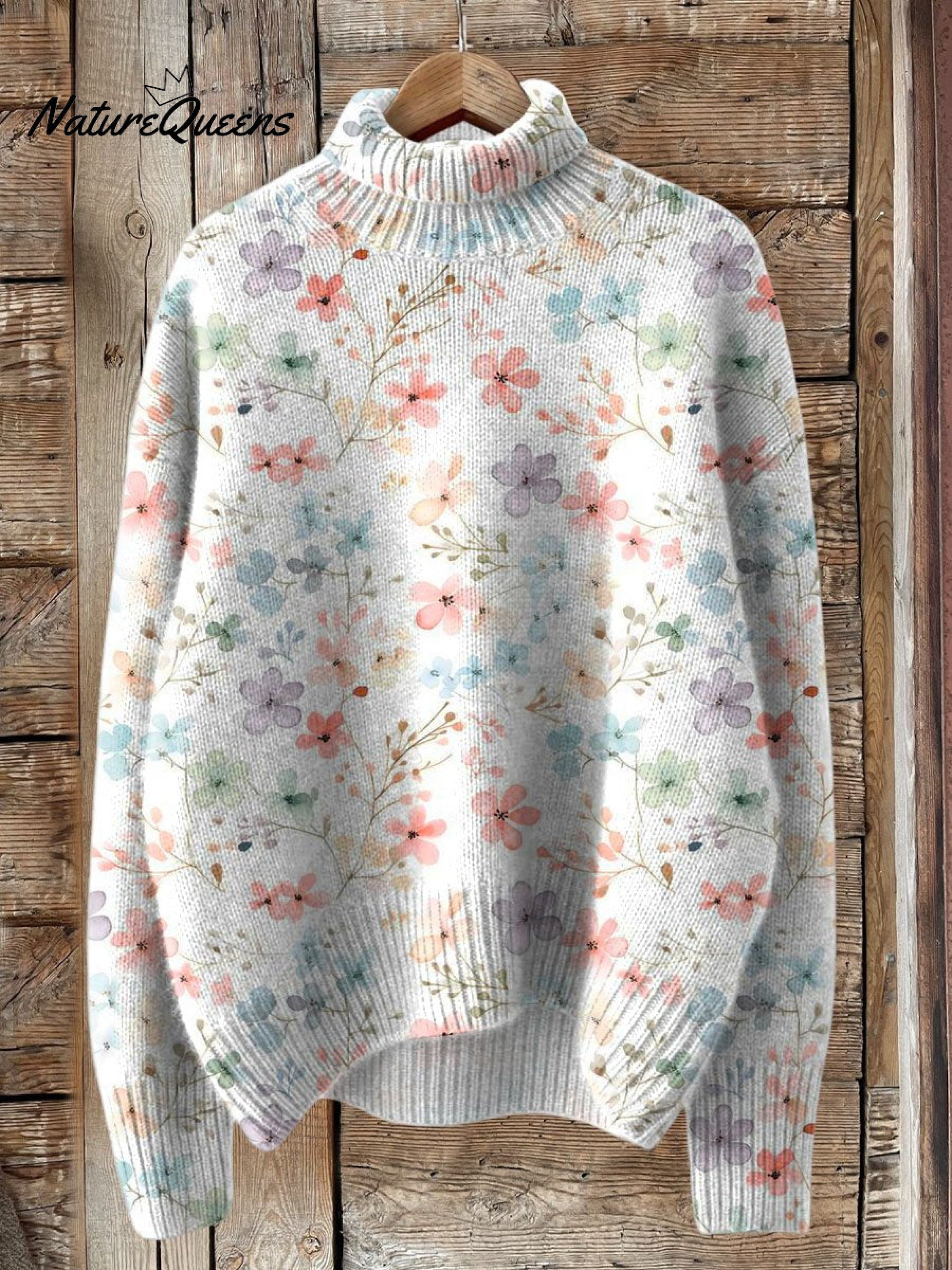 Lovely Floral Art Print Knit Turtleneck Pullover Sweater